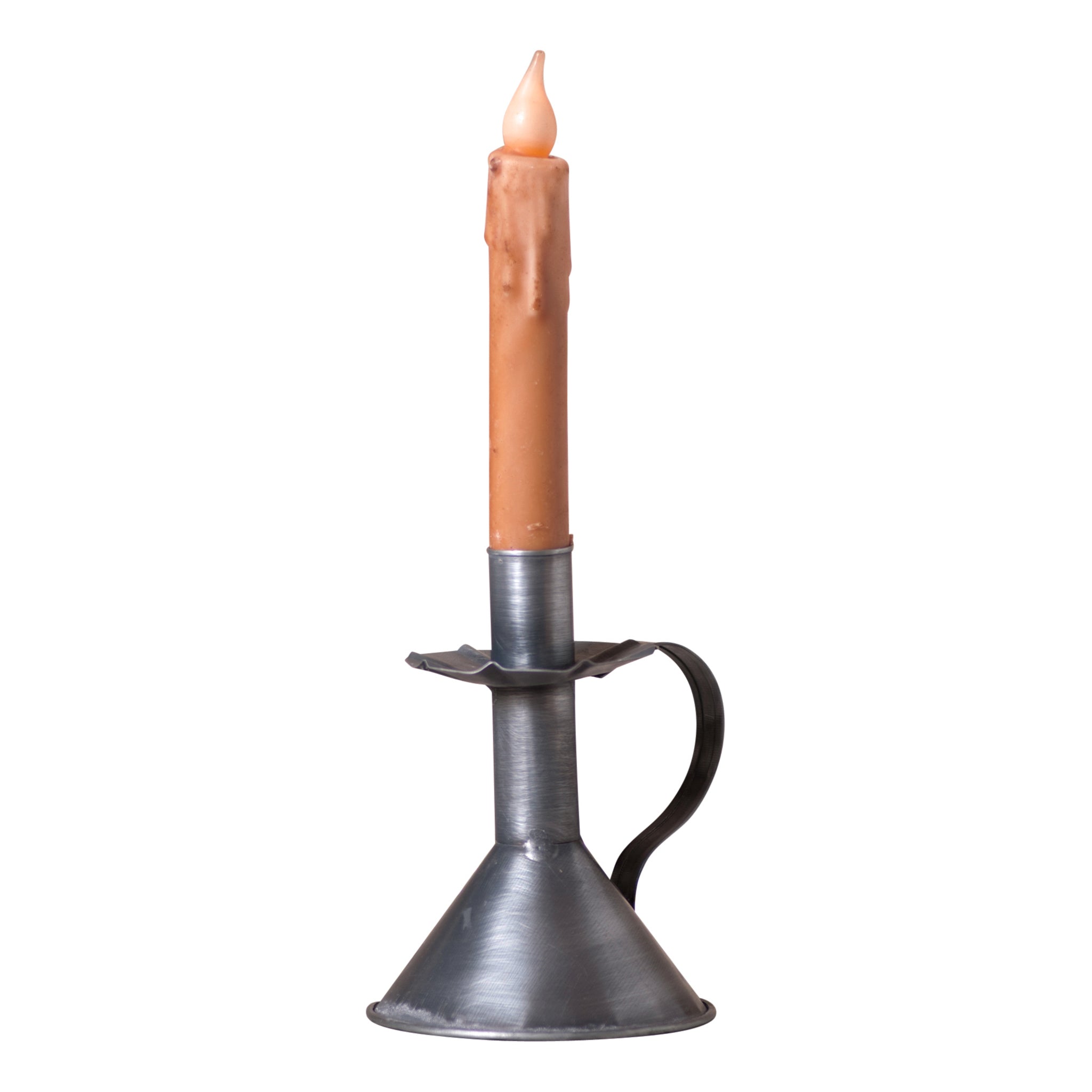 The Candle Stand in Antique Tin is a must-have for country farmhouse decor. Featuring a unique upside-down funnel design with a candle holder on top, it adds rustic charm to any space. Imported.