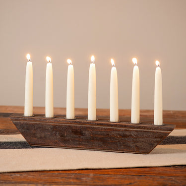 Showcase rustic elegance with our Vintage Wood Block Seven-Candle Holder with Tapered Sides. Handcrafted from reclaimed wood (finish and grain will vary), this unique design features angled edges and holds seven taper candles, perfect for creating a warm, inviting centerpiece. Ideal for dining tables, mantels, or seasonal decor, it blends farmhouse character with timeless charm. A stunning accent piece. Candles not included.