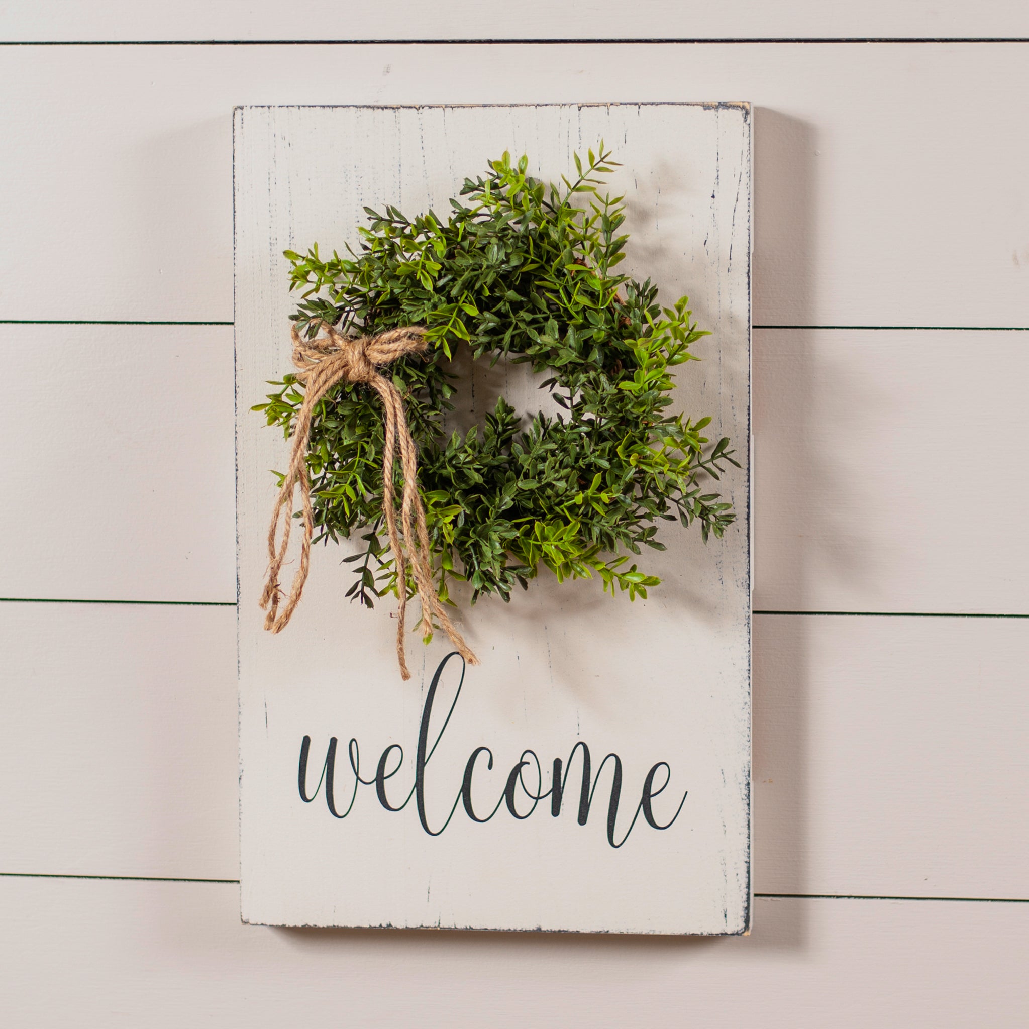 The essence of farmhouse decor is evident in this beautiful wooden sign adorned with a welcome and boxwood wreath.
