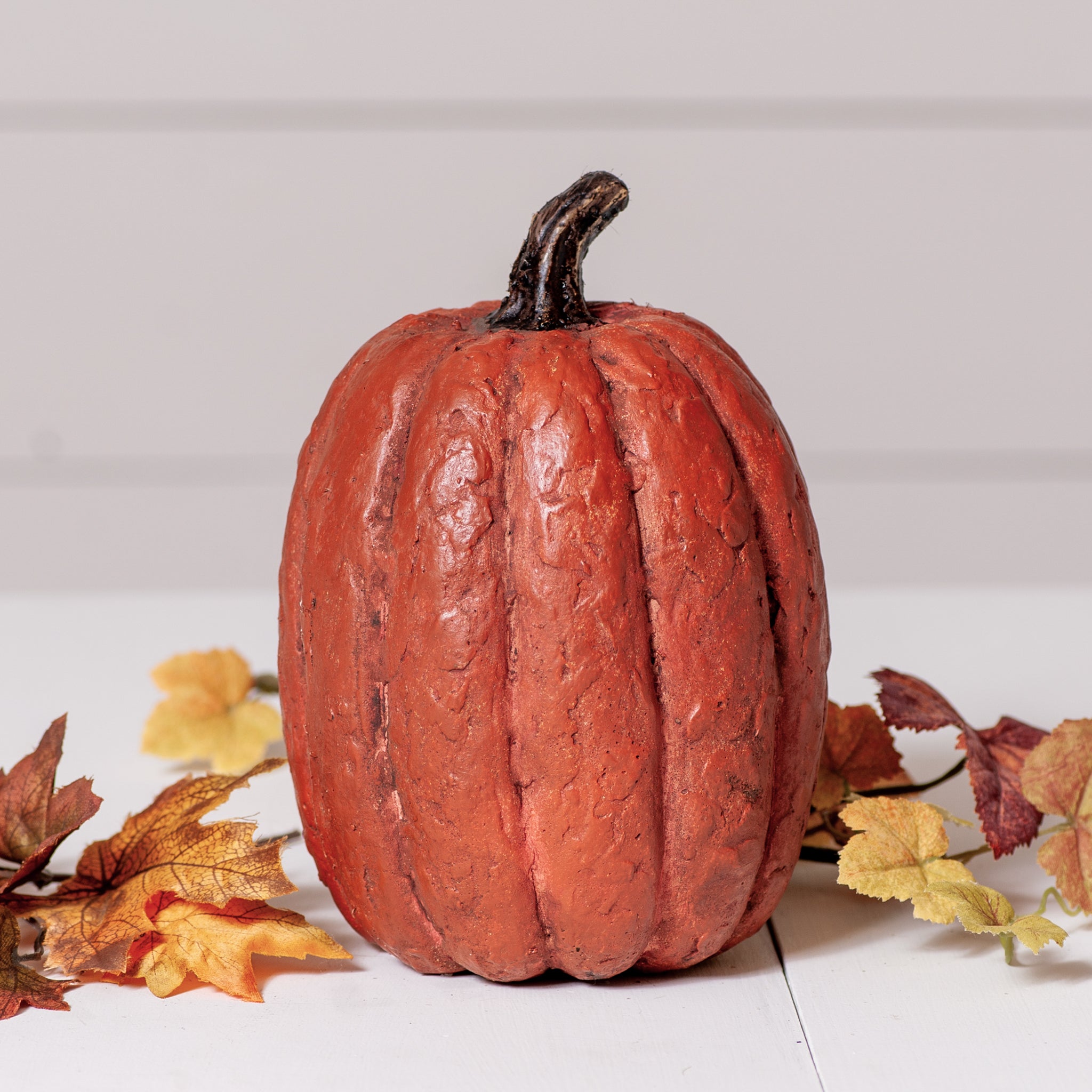 A beautifully realistic looking country pumpkin for fall and harvest decorating. Each one is a bit different due to the painting and distressing process. Imported.