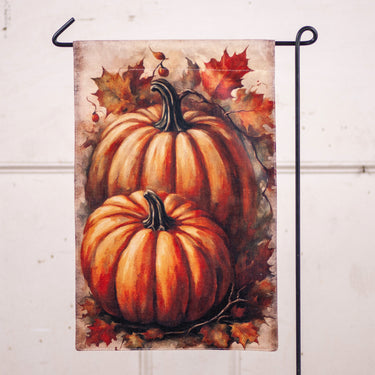 Celebrate the beauty of fall with our Harvest Pumpkins Garden Flag. Featuring two vibrant pumpkins surrounded by colorful autumn leaves, this flag brings seasonal warmth to your garden or entryway. Made from durable, weather-resistant fabric, it's perfect for outdoor display all season long. A festive way to welcome guests and showcase your love for autumn. Stand not included.