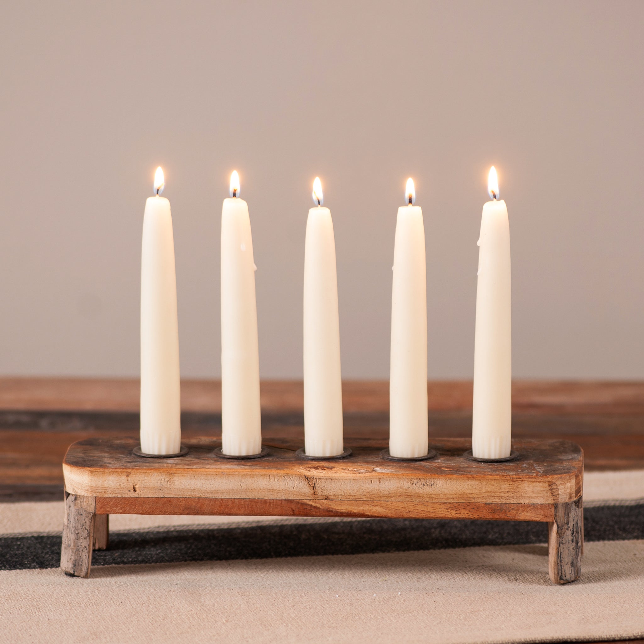 Add rustic elegance to your home with our Raised Vintage Wood Five-Candle Centerpiece. Crafted from reclaimed wood (finish and grain will vary) with a timeworn finish, it features five metal holders for taper candles. Perfect for dining tables, mantels, or seasonal displays, this charming piece brings warm ambiance and farmhouse style to any setting. A beautiful accent for everyday or holiday decor. Handcrafted in India.