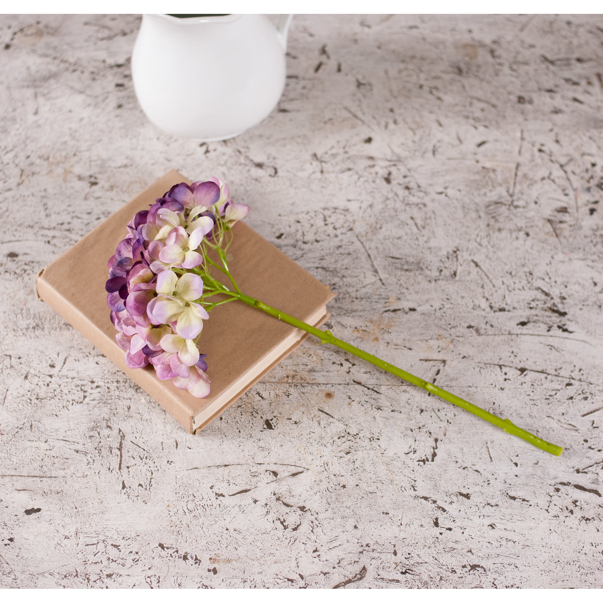 A realistic looking single hydrangea bloom to use in a vase, pitcher or crock on your kitchen counter for some summertime color. Imported.