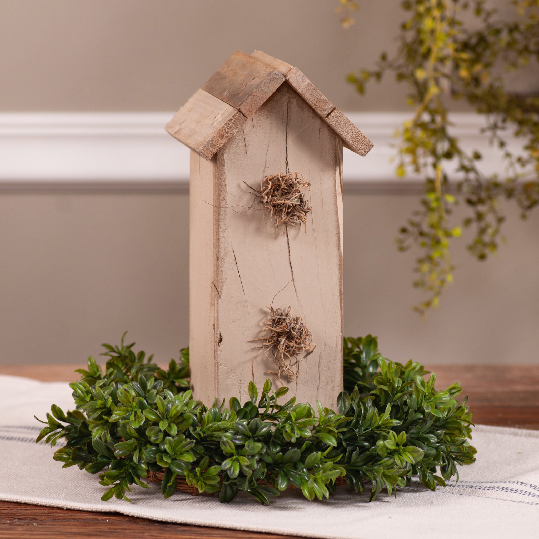 Bring rustic charm to shelves, mantels, and tabletops with this decorative wooden birdhouse. Finished in a soft, timeworn cream, it features a simple farmhouse silhouette and natural distressing for an authentic primitive look. Lightweight and easy to style, it adds cozy country character to seasonal displays, everyday decor, or tucked among greenery. Perfect for cottages, kitchens, and layered vignettes anywhere.