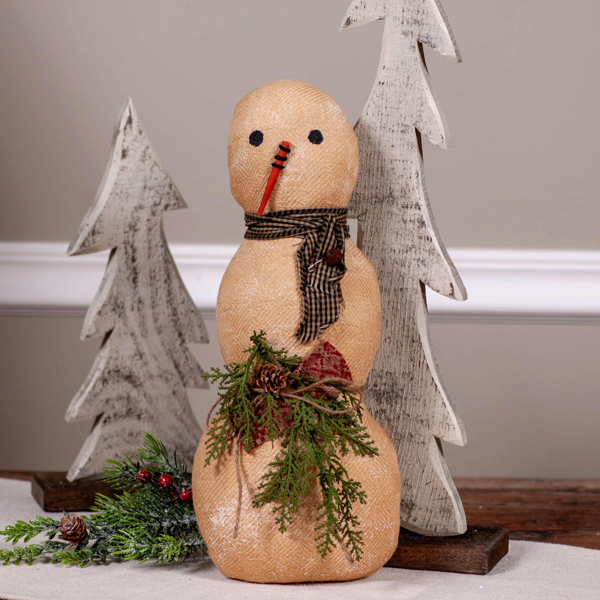 Bring timeless country charm to your holiday decor with this Homespun Handmade Snowman. Crafted with a textured fabric body, stitched accents, and a warm checked scarf, he holds festive greenery for a cozy seasonal touch. Perfect for mantels, shelves, or entry displays, this primitive-style snowman adds warmth, simplicity, and a welcoming spirit to your Christmas home.