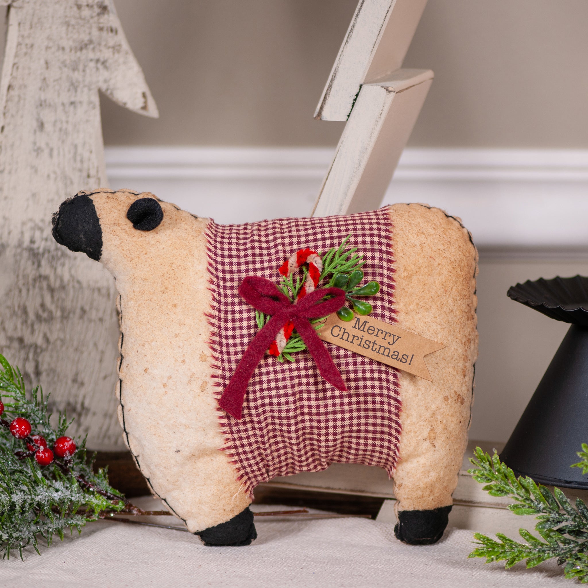 Add cozy farmhouse charm to your holiday decor with this Wool Sheep featuring a burgundy gingham sash and festive greenery. Accented with a felt bow and “Merry Christmas!” tag, this sweet decorative piece brings warmth and simplicity to mantels, shelves, and tabletop displays. A delightful seasonal accent that complements country, primitive, and rustic Christmas styles beautifully.