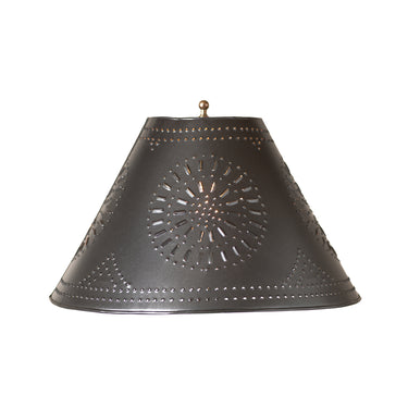 Add rustic country charm to your lamp with our flared metal shade. Featuring a punched chisel design and a durable smokey black powder-coated finish, it's both stylish and long-lasting. Designed with a spider fitting, it pairs perfectly with a harp and finial (not included). Handcrafted in India.