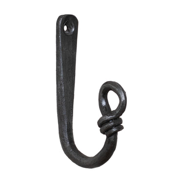 Experience the timeless charm of this hand-forged iron colonial-era classic, featuring a durable lacquer coating for rust-resistant, enduring durability. Crafted from a single piece of iron, this handmade iron wall hook features a distinctive knot at its end. Use in entryways for coats and on bathroom doors for towels and robes, it adds both functionality and a touch of rustic decor to your spaces. Handcrafted in India.