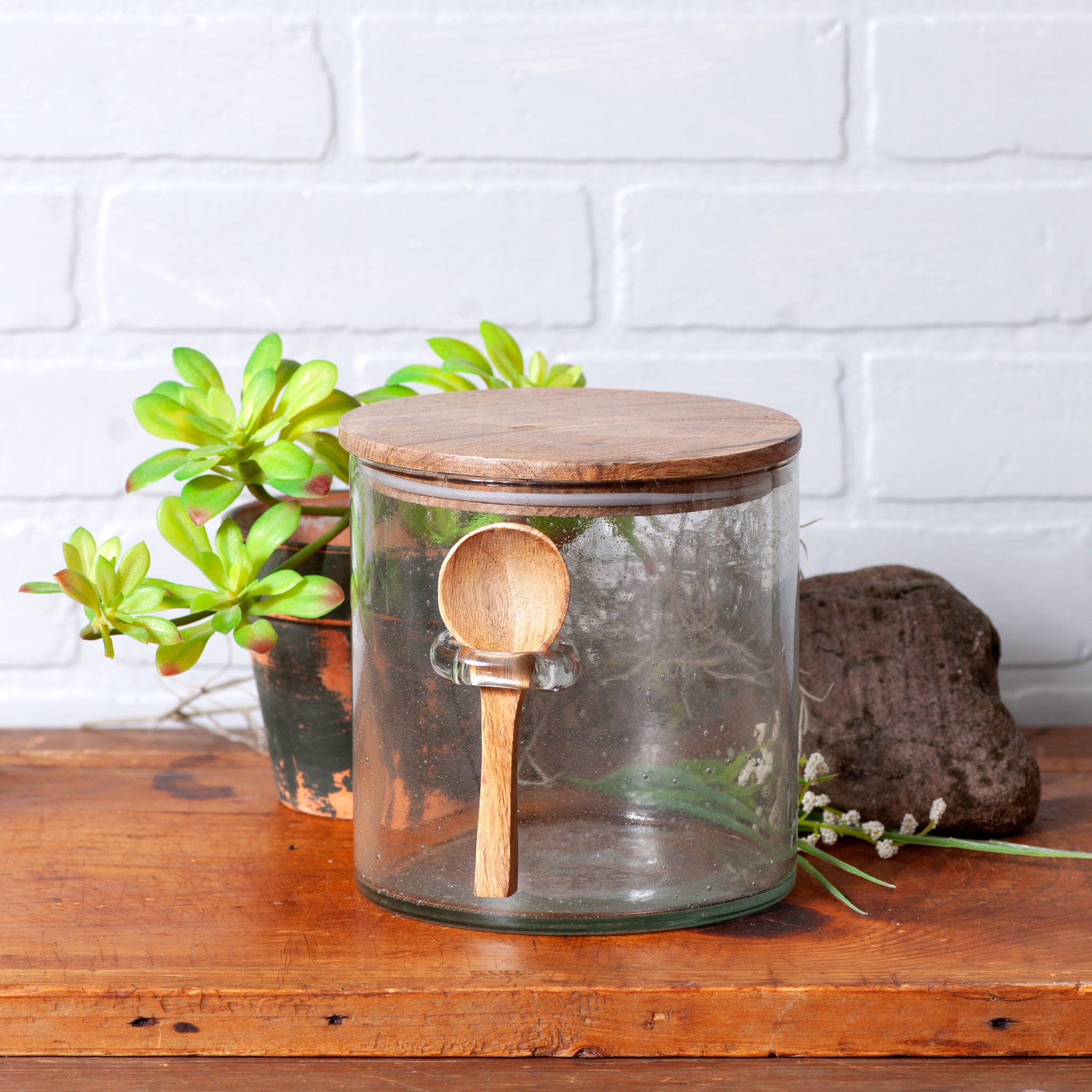 This bubble glass canister combines style and function. Perfect for storing bath salts, tea, cotton balls, or kitchen essentials like flour and sugar, its wide mouth ensures easy access. The wooden lid and spoon add charm, while thick sidewalls provide durability. Ideal for any room, this canister is a practical and stylish storage solution. Handcrafted in India.