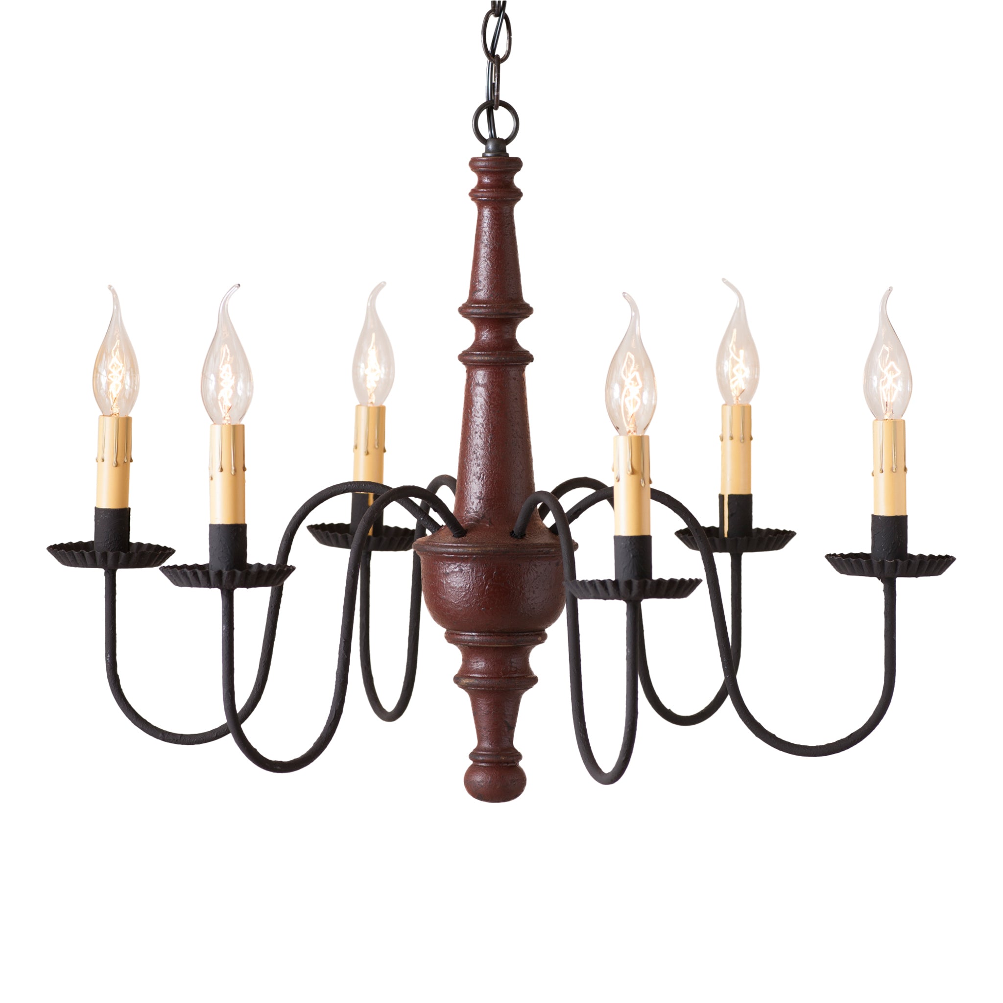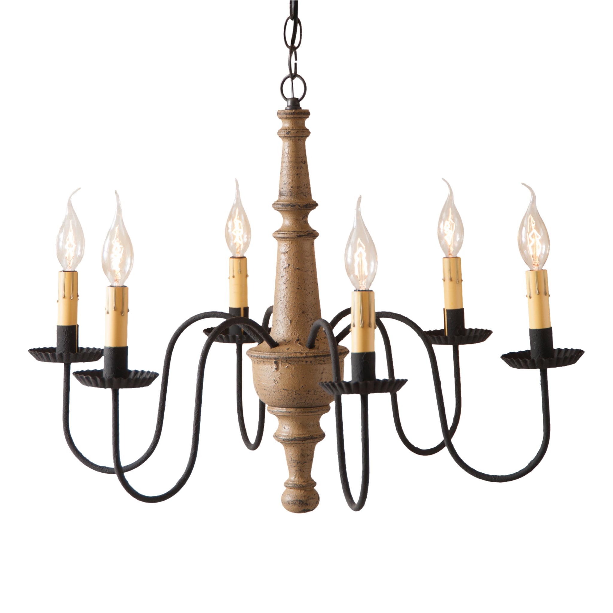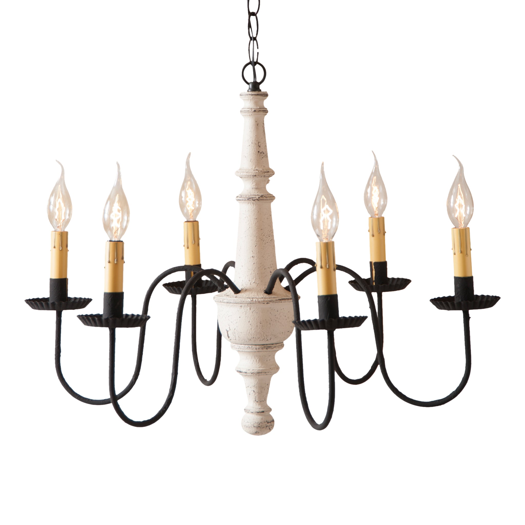 This chandelier features a textured finish that radiates understated elegance and antique charm. Perfect for colonial settings, it boasts black textured arms with crimped pans and a lightly distressed, painted center, creating an authentically timeless look.