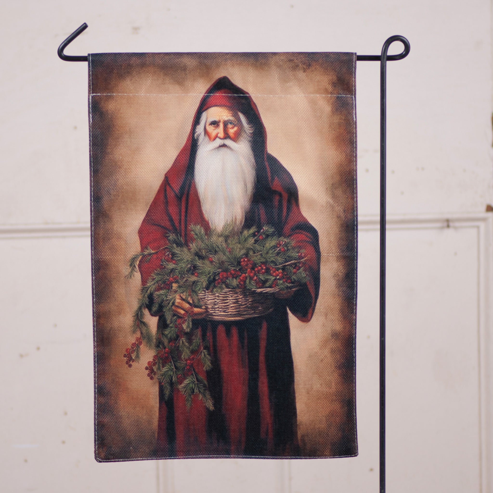 Welcome the holiday season with our Father Christmas Garden Flag. Featuring a vintage-style Santa in a deep red cloak holding a festive basket of pine and berries, this flag adds timeless charm to your outdoor decor. Made from durable, weather-resistant fabric, it's perfect for displaying all winter long. A nostalgic touch for porches, walkways, or garden beds. Stand not included.