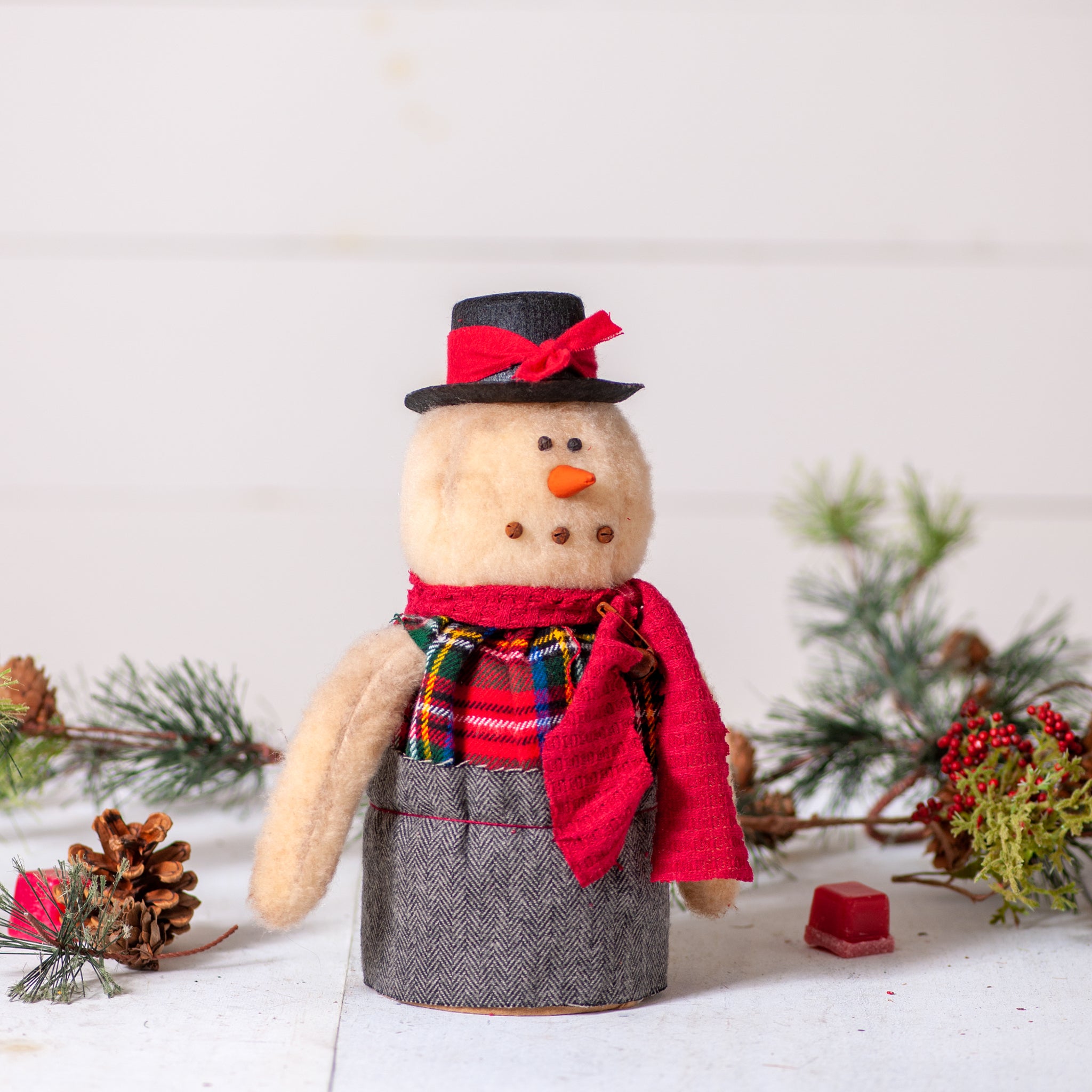 The slightly grunged Handmade Baby Snowman is suited up in his finest plaid with a red scarf. He is weighted and will sit well on a shelf, table or window sill for the winter season. Made in the USA.