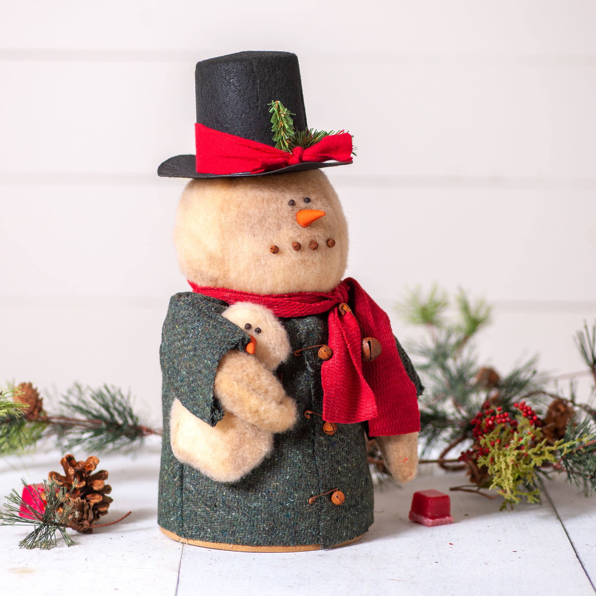 The slightly distressed Snowman is all dressed for the season in a stylish coat with scarf holding a small snowbaby. He is weighted and will stay in place wherever you choose to display him. Made in the USA.