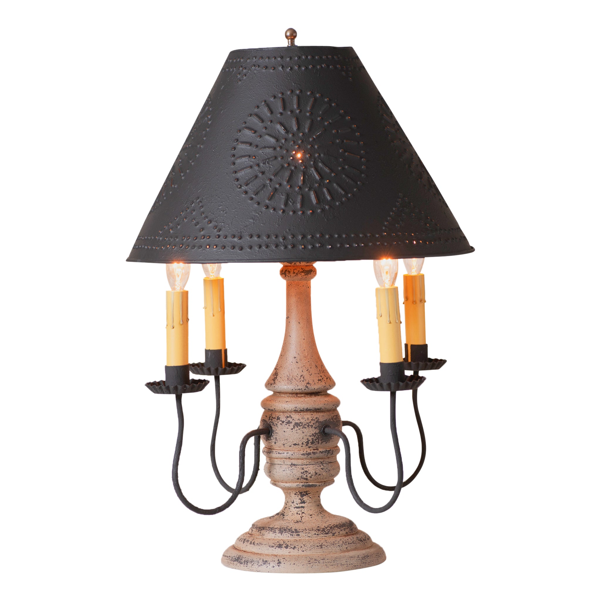 The Jamestown Lamp is a finely crafted table lamp that brings a touch of genteel country charm, reminiscent of a gentleman's farm or an Old South plantation. It features four E12/candelabra arms and a top E26/medium (standard) socket with three-way lighting capability. The solid Poplar hardwood base is hand-painted for a beautifully rustic finish, making it a timeless and elegant addition to your home.