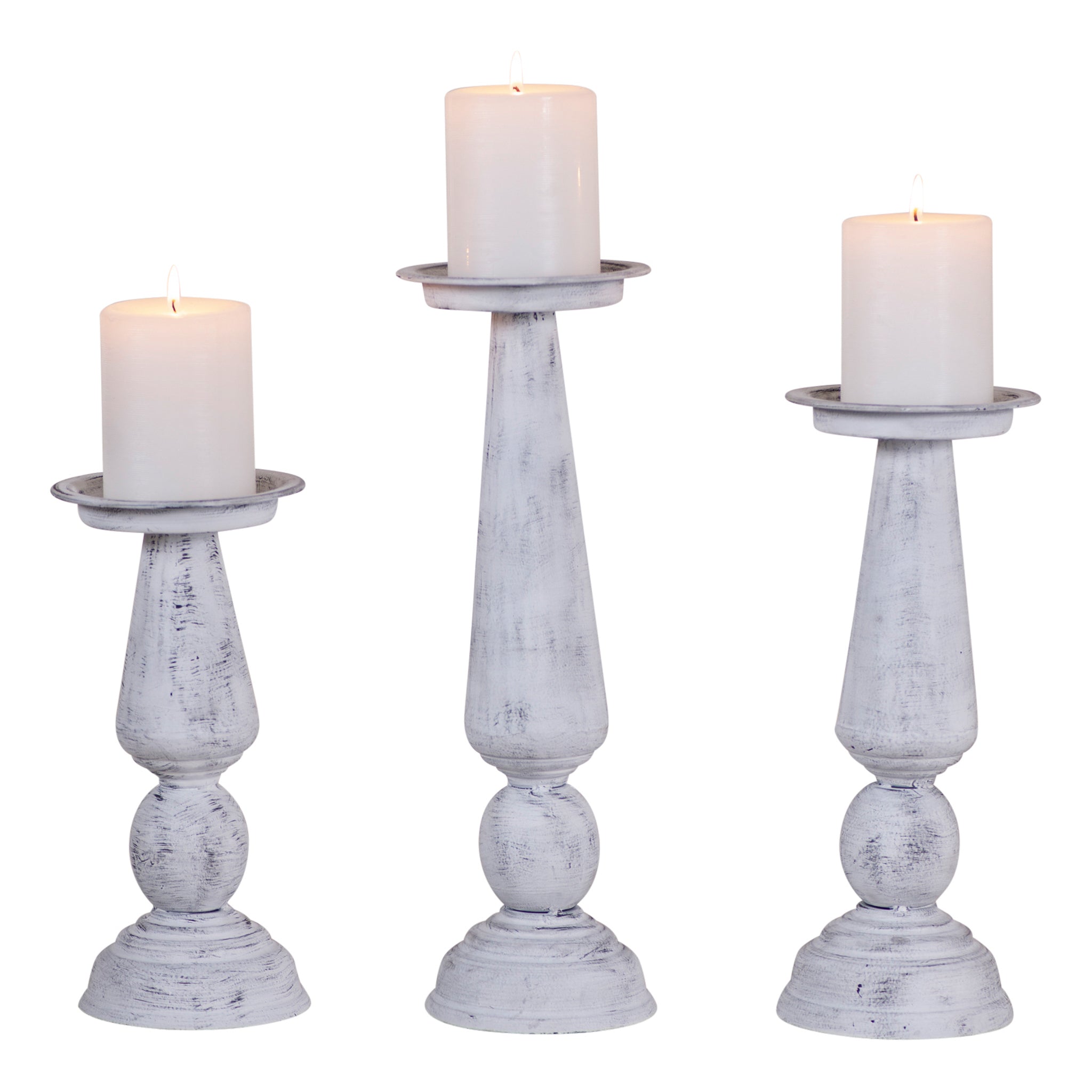 Crafted from iron with a rustic white finish, these 14", 12" and 10" high pedestal candle stands combine vintage and rustic charm to create a romantic ambiance for special occasions like weddings, parties, or candlelit dinners. Designed for candles 3.1" or smaller in diameter, they are perfect for table centerpieces, mantels, or coffee tables. Whether for your fireplace mantel or dining room, these metal pedestal candle holders add a charming touch with real or battery-operated pillar candles. Imported.