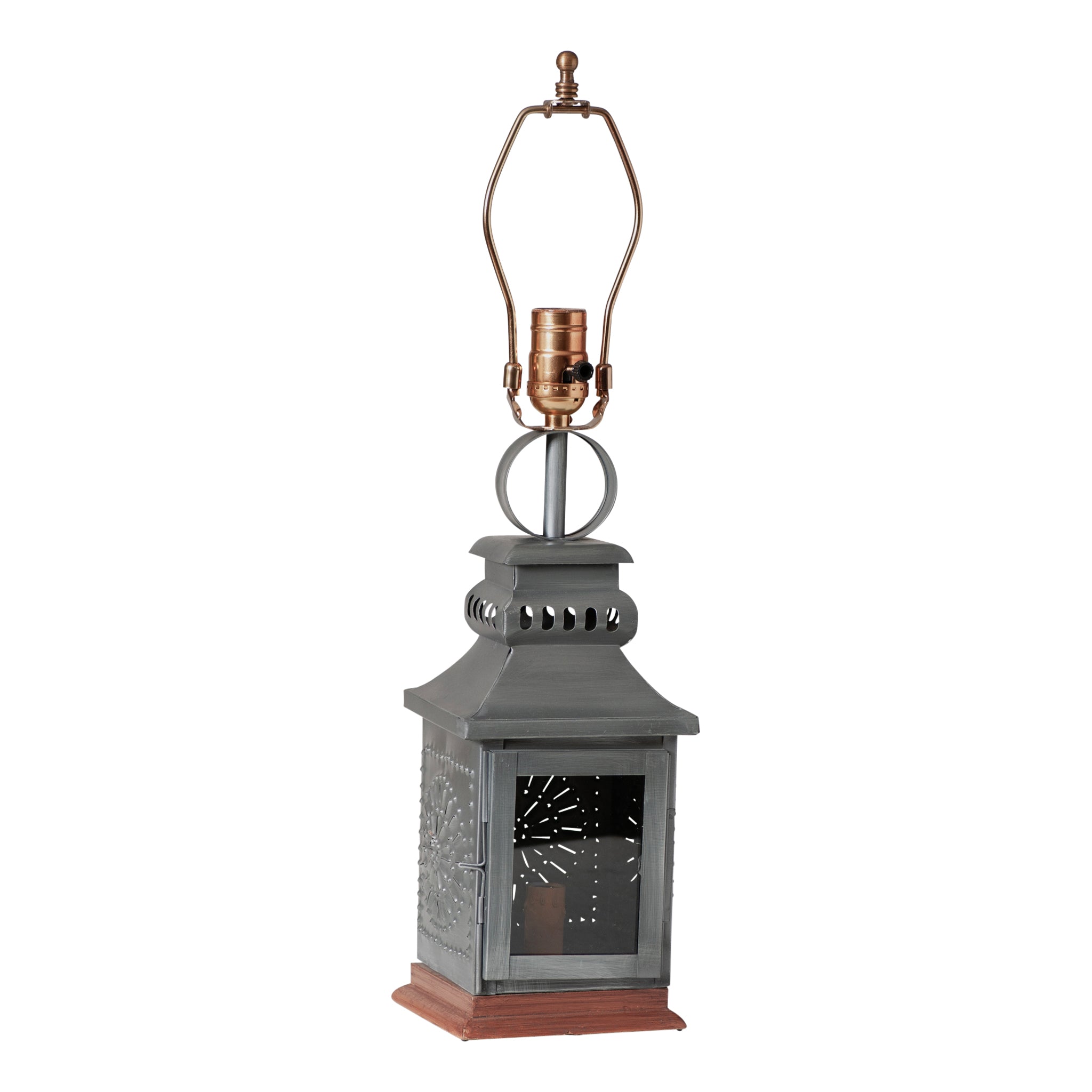 The Miner's Lamp Base in Antique Tin features an intricately crafted lantern-style design, offering beauty and detail from every angle. Its timeless charm makes it a standout addition to any space. Designed to pair with a 15-inch antique tin or fabric flared shade (sold separately), it adds character and charm to any space. Handcrafted in India.