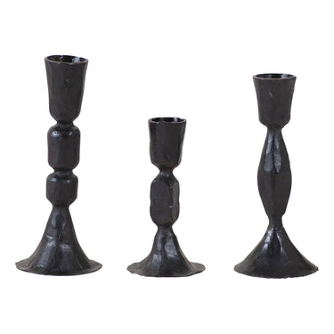 Made from durable cast iron, these sleek black candle holders features a classic tapered design that offers a sturdy base for standard taper candles. Perfect as a centerpiece on your dining table or as a stylish accent in your home, it adds warmth and timeless elegance to any space. Handcrafted in India.