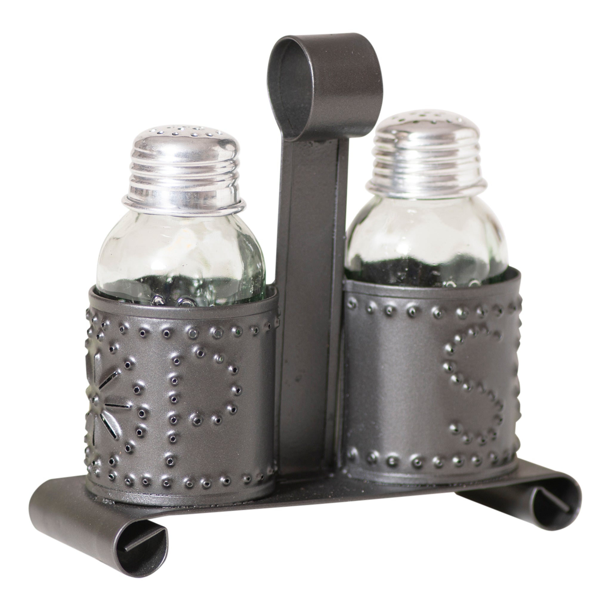 The Salt and Pepper Shaker Holder in punched tin adds farmhouse charm to your kitchen. Complete with mason jar shakers featuring nickel-finished tops, it's both practical and stylish, a perfect housewarming or shower gift! Handcrafted in India.