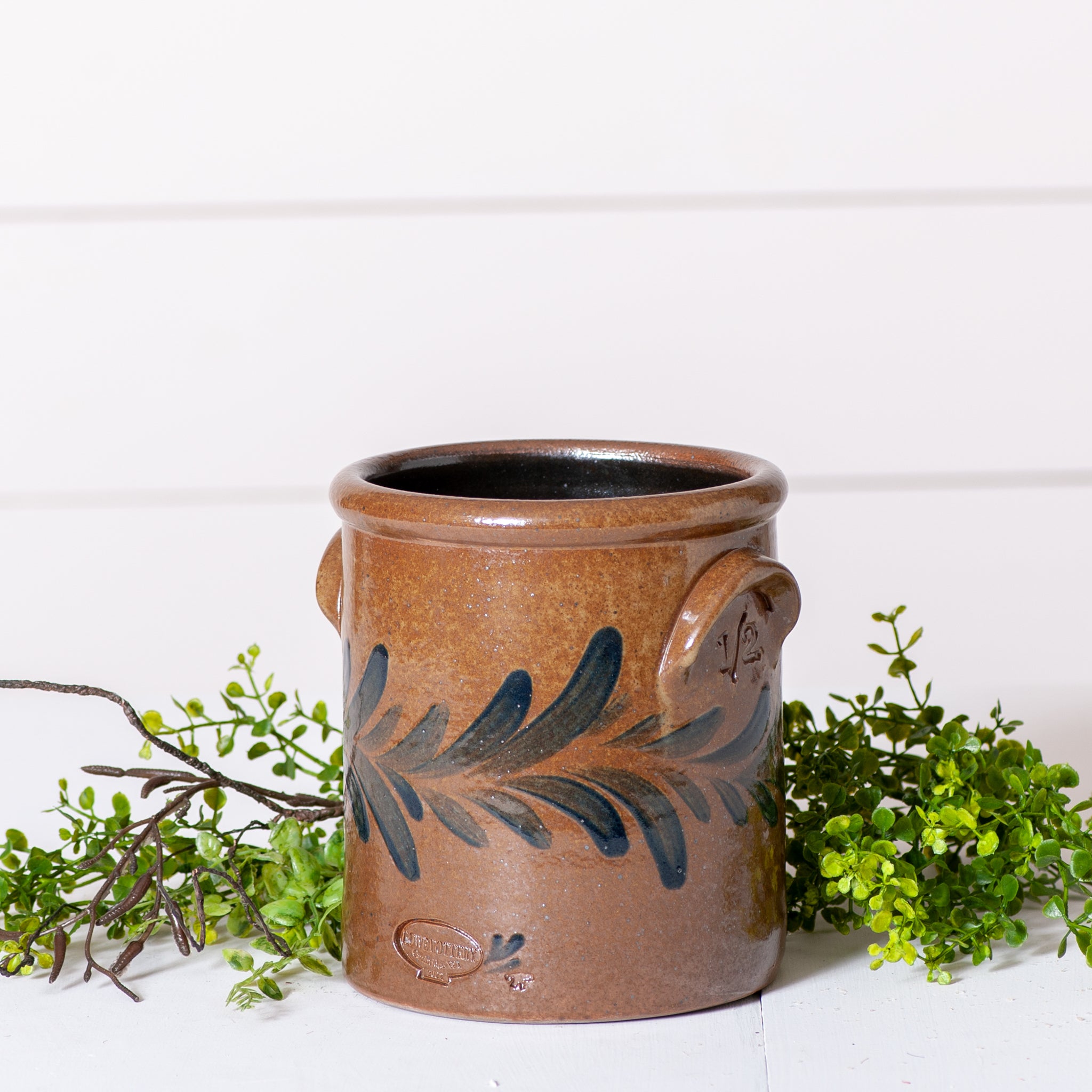 Our salt-glazed pottery is handmade in Wisconsin where each piece is hand decorated and kiln fired, creating a unique piece each and every time. No two pieces or coloring are ever identical due to the process and kiln placement. Colors may range from a lighter wheat background to a darker cinnamon.