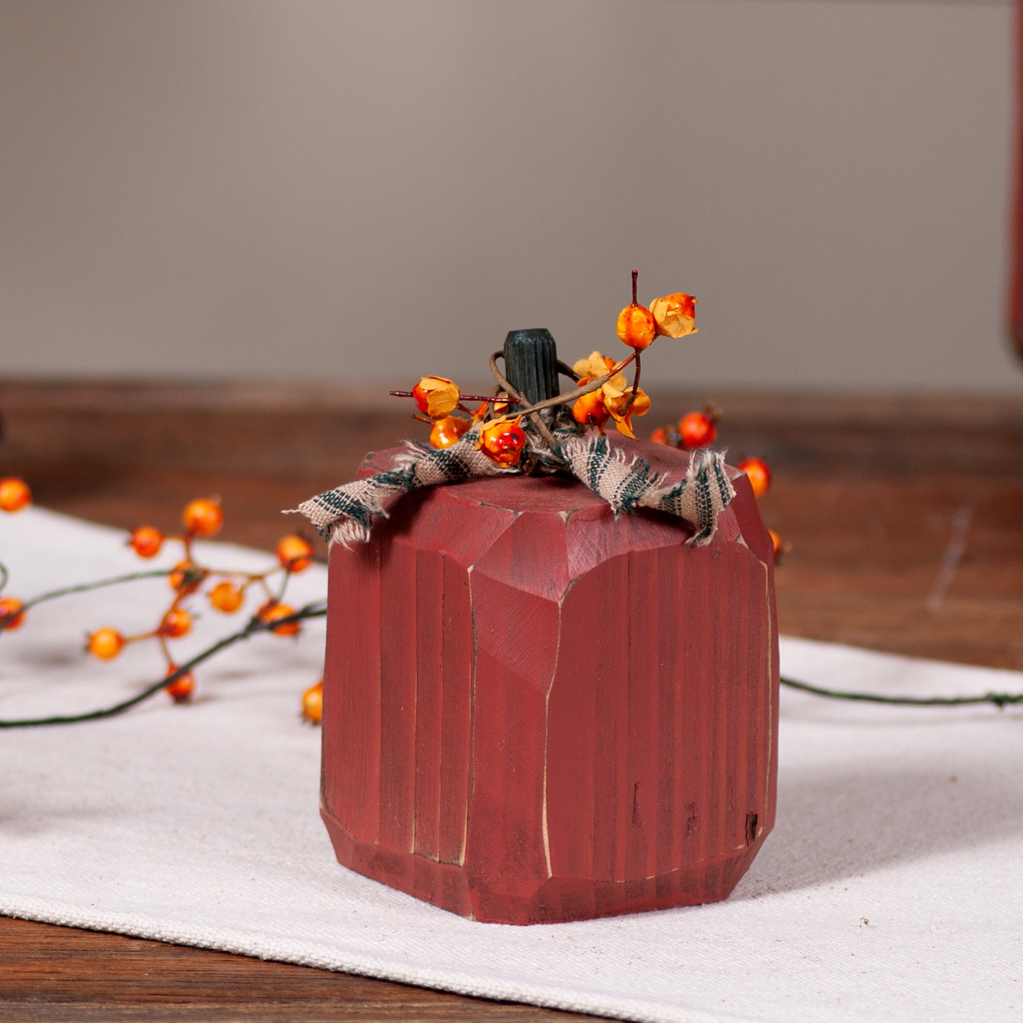 Add a pop of rustic charm with our Short Thin Wooden Pumpkin in Terra Cotta. Hand-painted and lightly distressed for a timeworn look, it's topped with a green stem, plaid bow, and vibrant berry sprig. Ideal for small spaces, tiered trays, or grouping with other pumpkins, this handcrafted accent brings cozy fall character to any room.