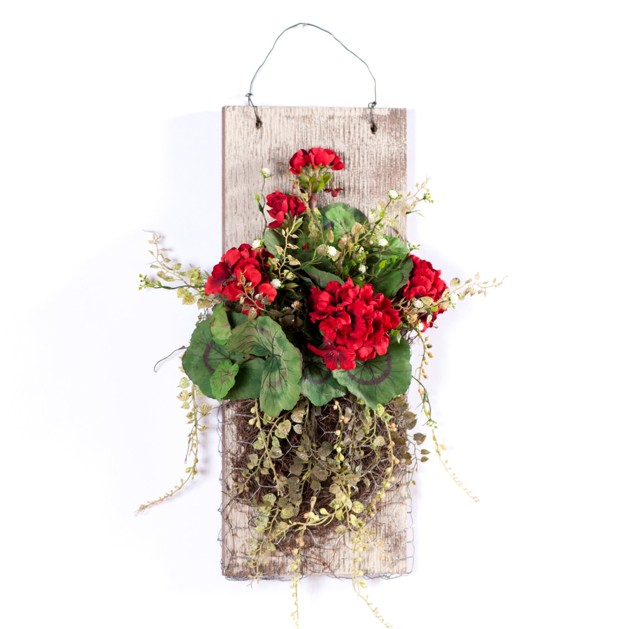 The beautifully rustic Geranium Wall Board is the perfect primitive accent for summertime. The washed white finish and the bright geranium blossoms lend this piece to both farmhouse and country decorating. Made in the USA with all new materials.