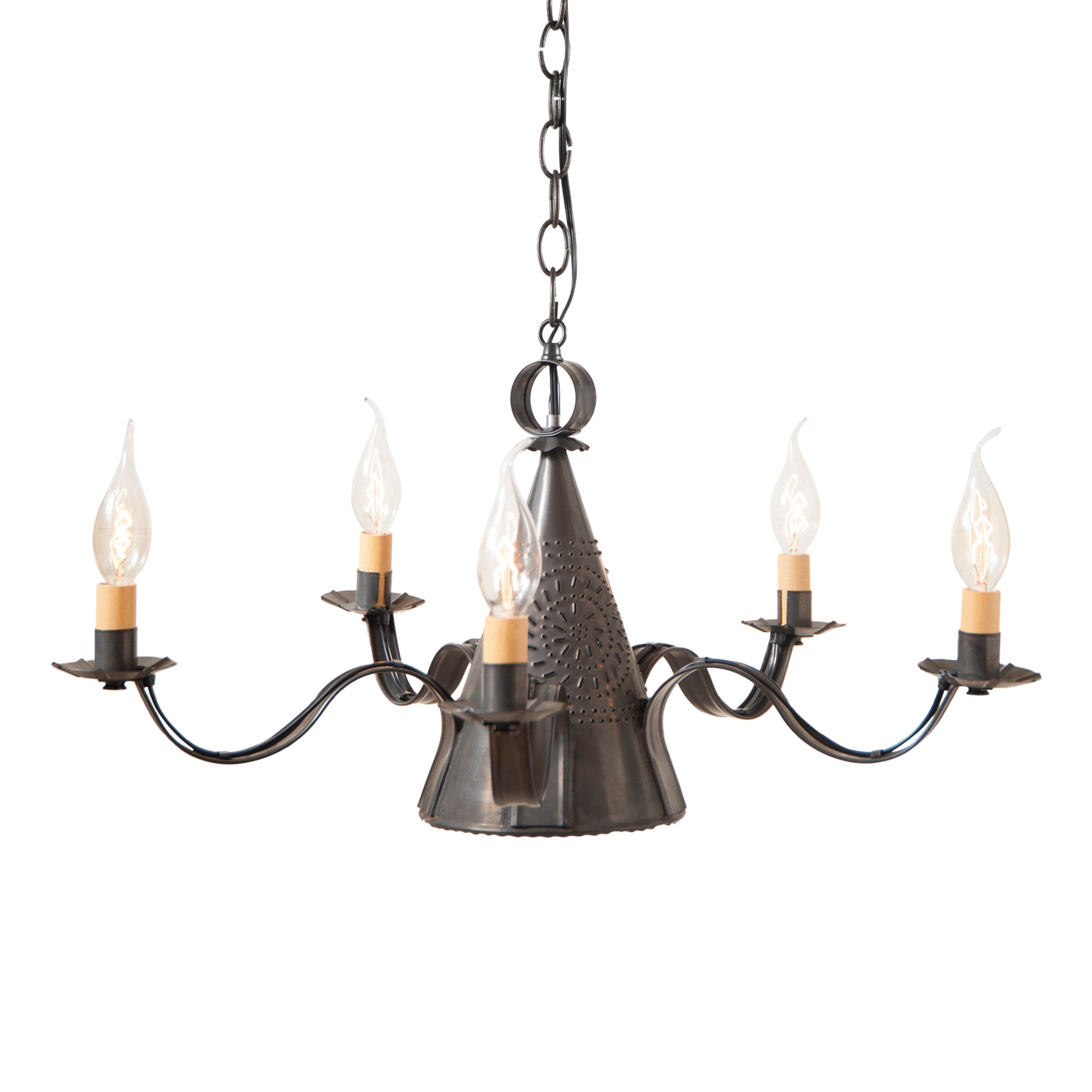 The Small Sturbridge Chandelier exudes country elegance with heirloom-quality craftsmanship. Featuring a pierced center cone for reflective down-lighting and graceful E12/candelabra arms, this timeless piece is designed to be cherished for generations.