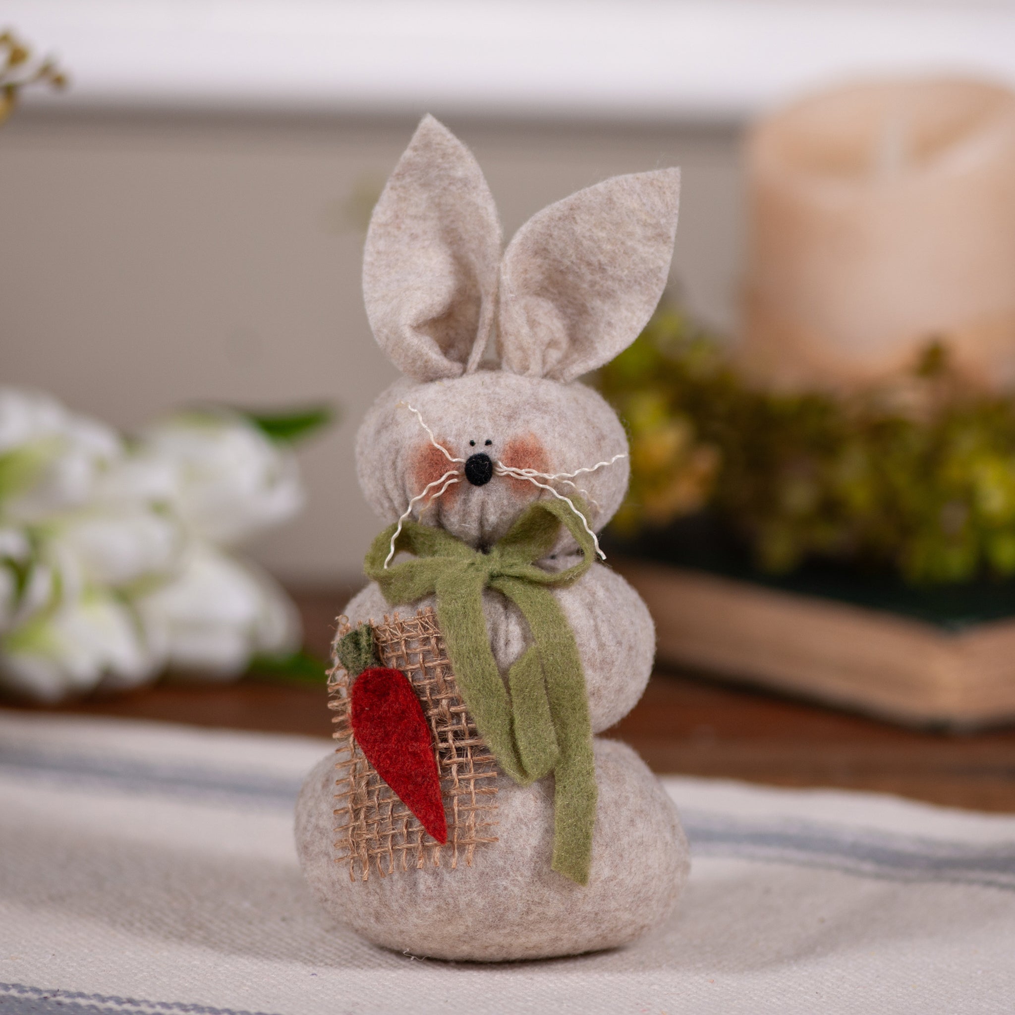 Add a touch of springtime charm to your home with this handcrafted felt bunny. Soft neutral tones, rosy cheeks, and a rustic burlap patch with carrot accent create a warm, primitive look. Perfect for tabletops, shelves, or seasonal displays, it brings texture and farmhouse character to Easter decorating and everyday country style throughout the season and beyond today anywhere beautifully.