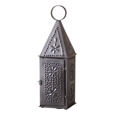 Add rustic charm to any small space with this square punched tin lantern. Inspired by old-time tinware, it brings a touch of nostalgia to your decor. Finished in smokey black, it holds a battery-operated or regular taper candle (sold separately). Handcrafted in India.