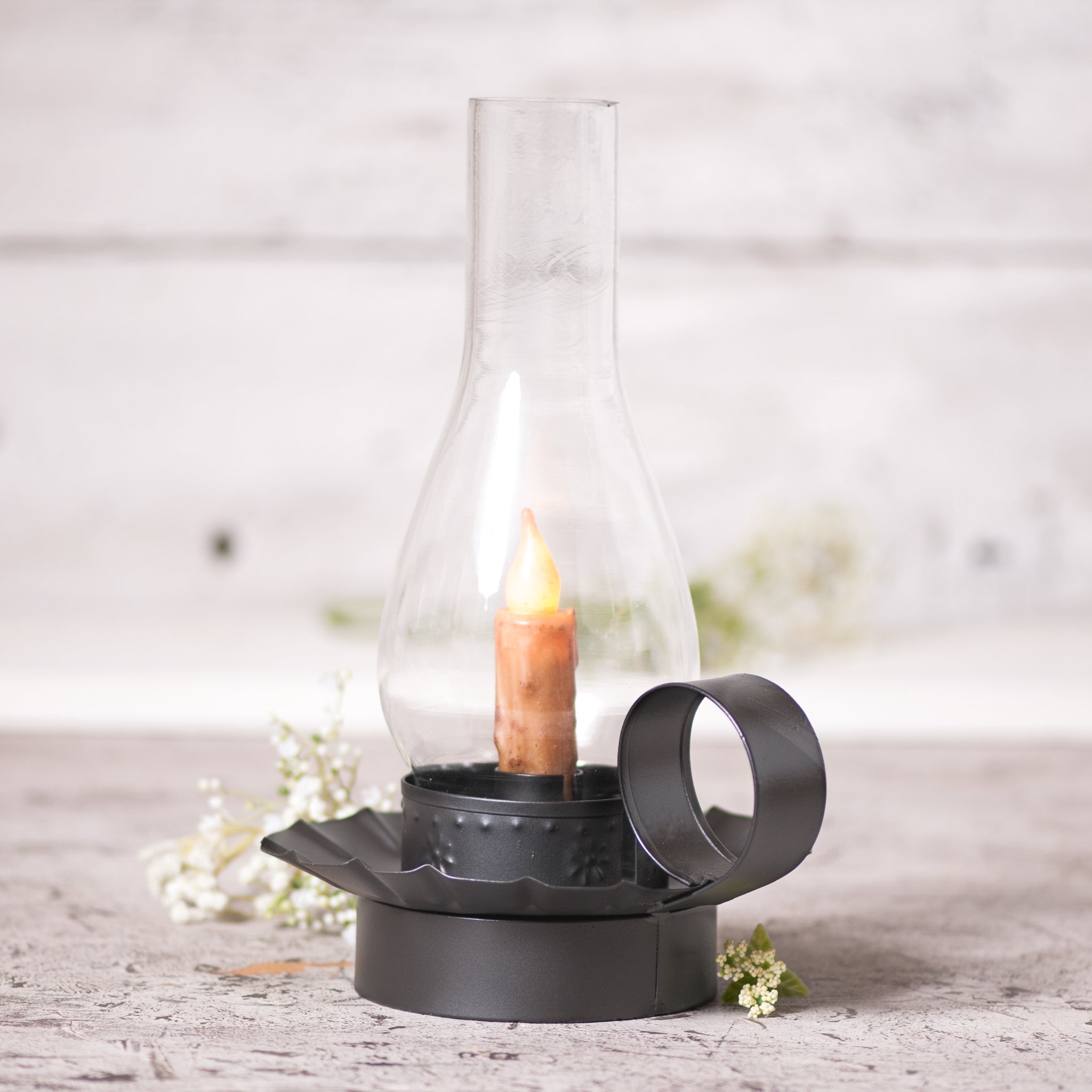 Featuring a charming chisel punch pattern, this chimney candle holder blends perfectly with rustic country decor. Finished in durable smokey black powder coating, it includes a glass globe and fits a 1-inch diameter battery-operated or regular taper candle (not included). Imported.