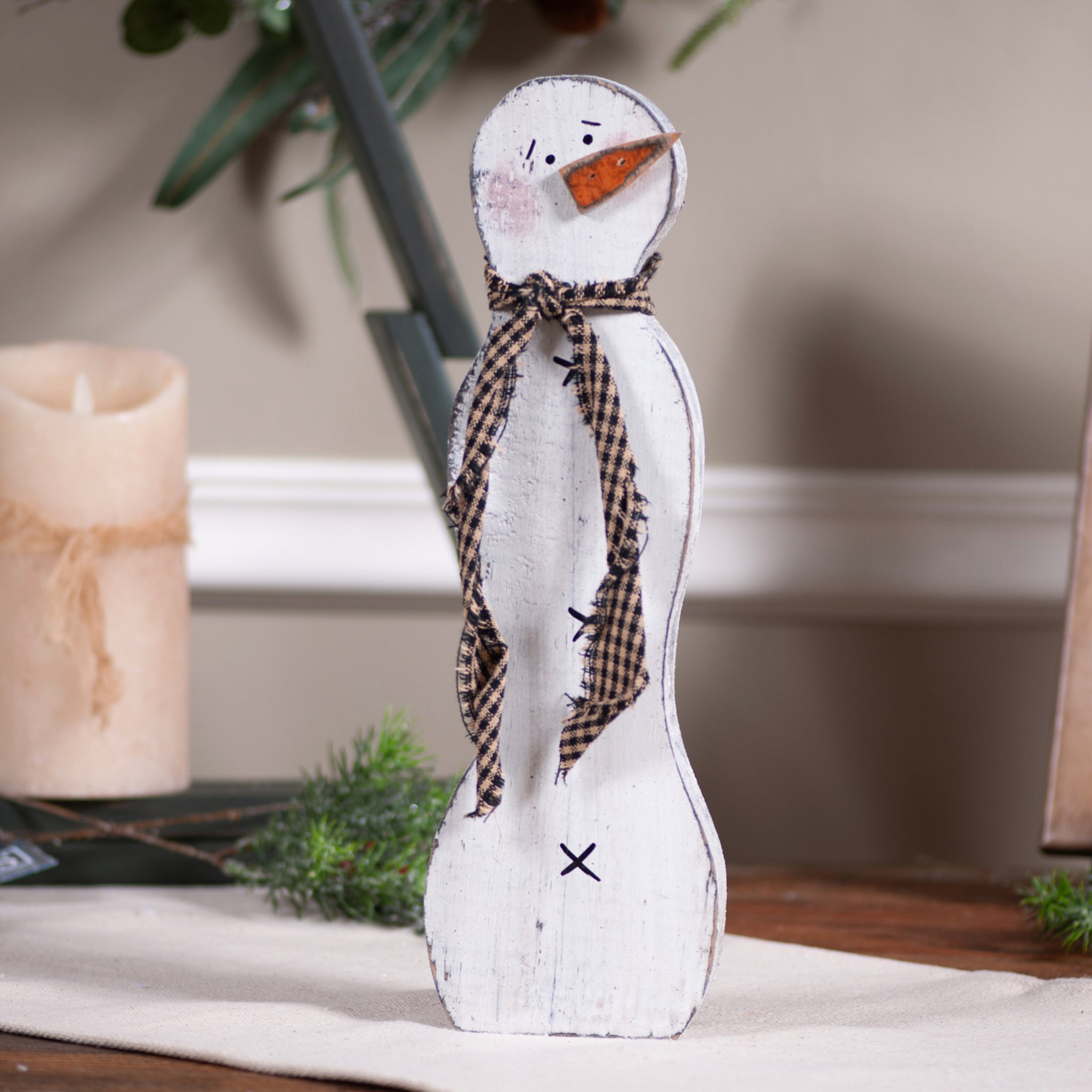 Meet Stormy the Snowman - a tall, charming primitive accent perfect for adding rustic winter warmth to your home. With a distressed hand-painted finish, simple stitched-style details, rosy cheeks, and a cozy homespun scarf, he brings handcrafted character to shelves, mantels, and entryway displays. A delightful addition to farmhouse and country decor for the entire holiday season.