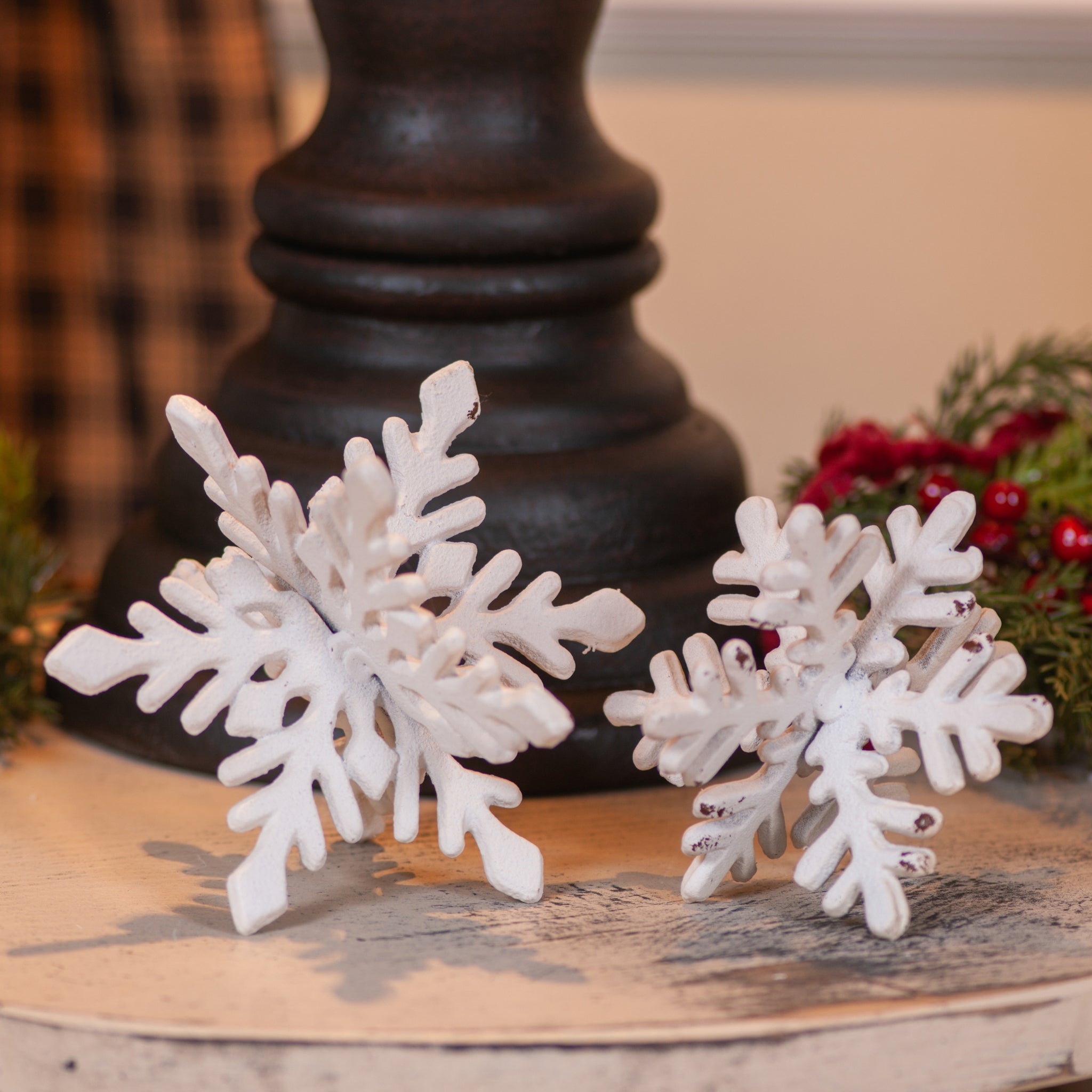 Add a touch of winter charm to your decor with this Set of Two Tabletop Iron Snowflakes. Crafted from sturdy metal and finished in rustic white, each snowflake brings a frosty, handcrafted feel to your holiday displays. Perfect for mantels, shelves, or table centerpieces, they pair beautifully with greenery, candles, and festive accents.