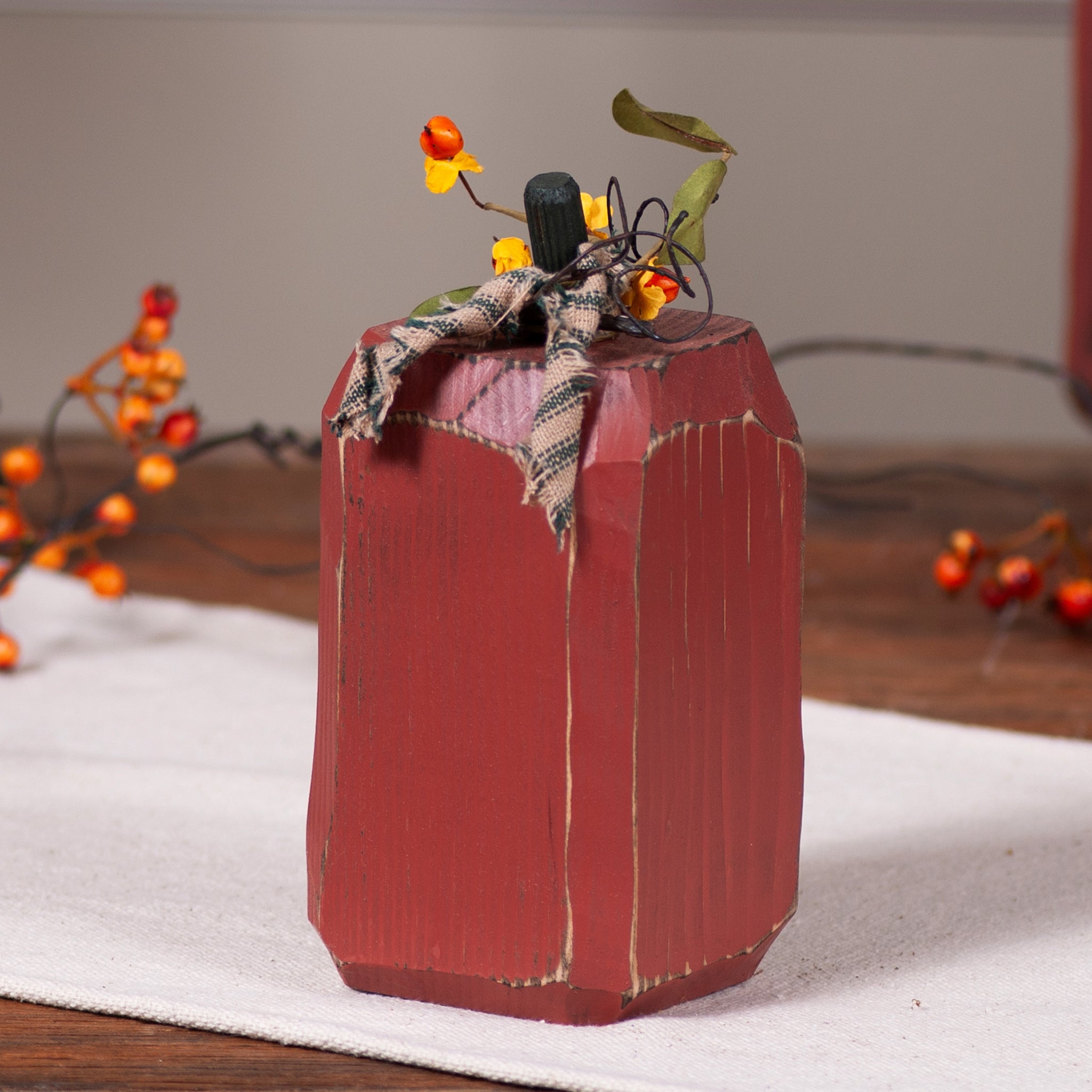 Our Tall Thin Wooden Pumpkin in Terra Cotta adds height and rustic charm to your fall decor. Hand-crafted with a distressed finish, it's topped with a green stem, plaid ribbon, and festive berry sprig. Perfect for layering with other pumpkins or displaying solo on mantels and tabletops, this handcrafted piece brings cozy autumn style to any space.