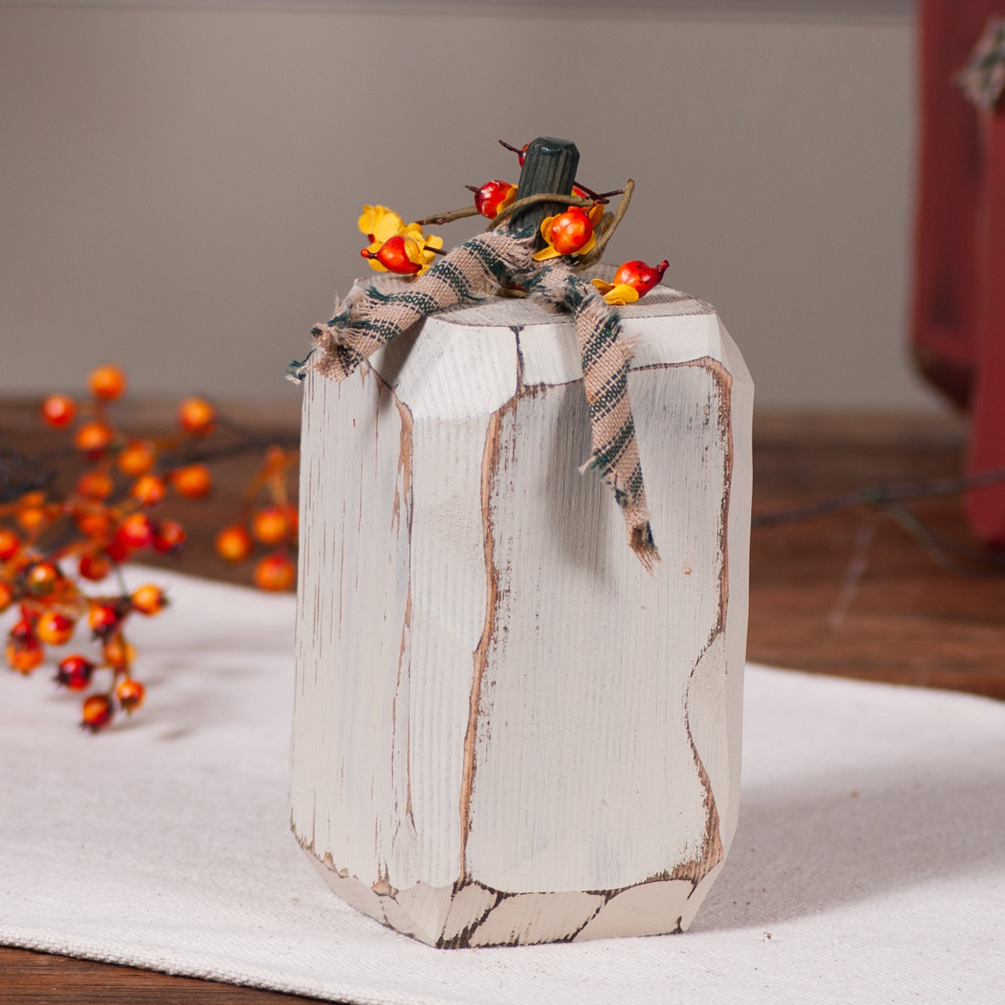 Add rustic elegance to your seasonal decor with our Tall Thin Wooden Pumpkin in White. Featuring a hand-distressed finish, green stem, plaid ribbon, and berry sprig, this handcrafted piece blends rustic charm with timeless style. Perfect for mantels, shelves, or tabletop groupings, it brings warmth and dimension to your fall decorating and can be enjoyed year after year.