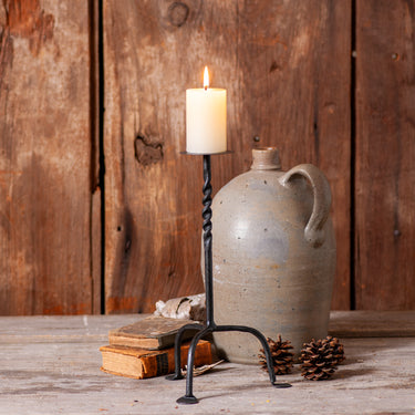 This antique-inspired candle holder, featuring a twisted center rod, celebrates Colonial heritage. Perfect for Early American and rustic farmhouse decor, its aged finish with a durable lacquer coating resists scratches and rust. Holds up to a 2.5-inch pillar candle for timeless appeal. Imported.