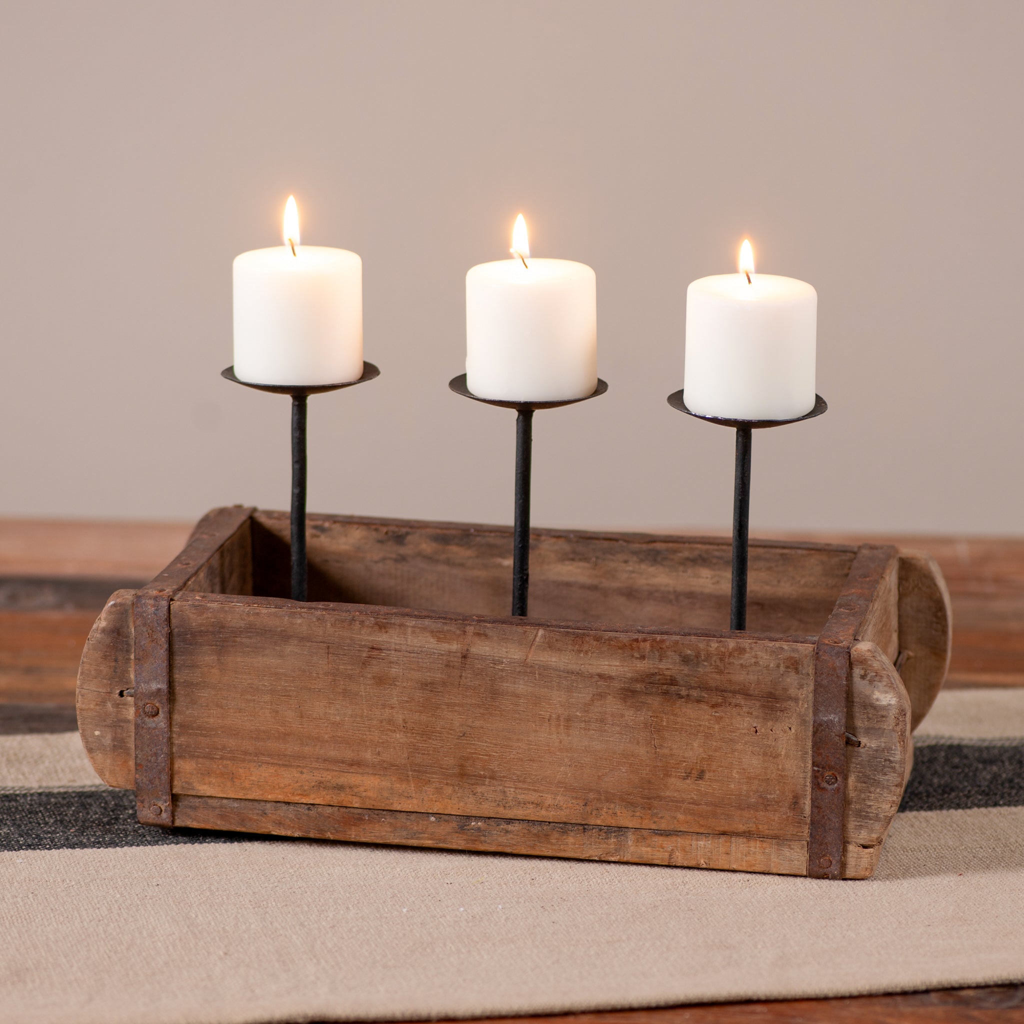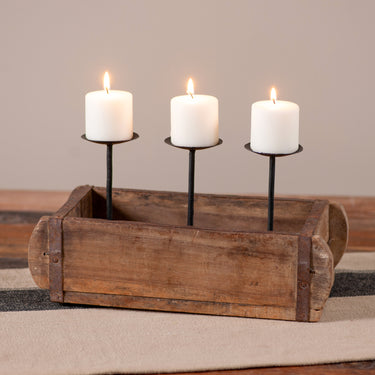 Enhance your farmhouse decor with our Vintage Wooden Brick Mold with Raised Candle Holders. This charming piece features a reclaimed wood base (finish and grain will vary) paired with three elevated iron holders for pillar candles, blending rustic character with timeless elegance. Perfect for mantels, centerpieces, or seasonal styling, it adds cozy warmth and vintage appeal to any room. Candles not included. Handcrafted in India.