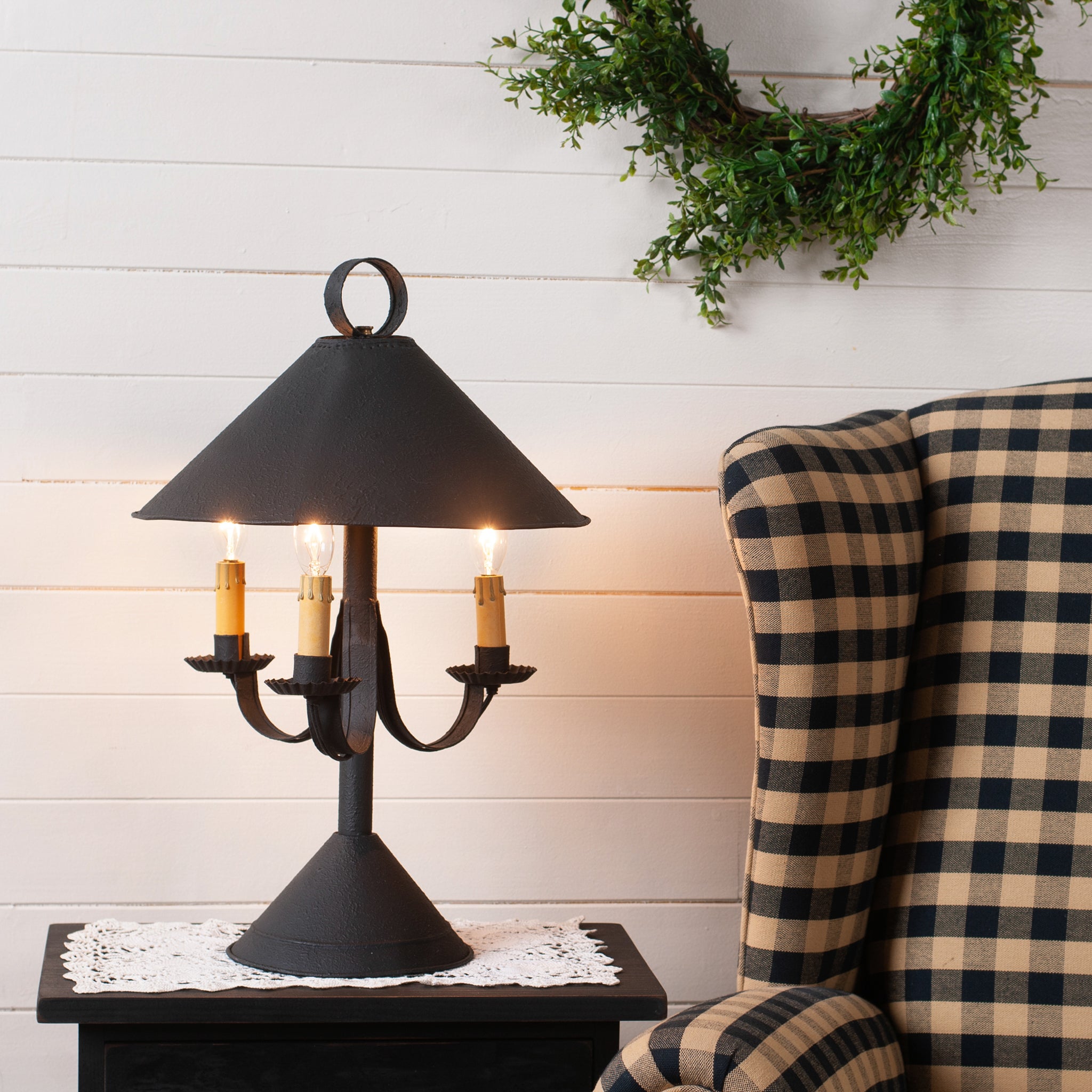 A bold primitive accent light perfect for your desk or reading nook. Featuring three sockets for adjustable brightness, it provides ample light for projects and reading. The unique triple-light design, paired with a classic shade, echoes the charm of antique lamps. Finished in a textured black paint for a rustic touch. Handcrafted in India.