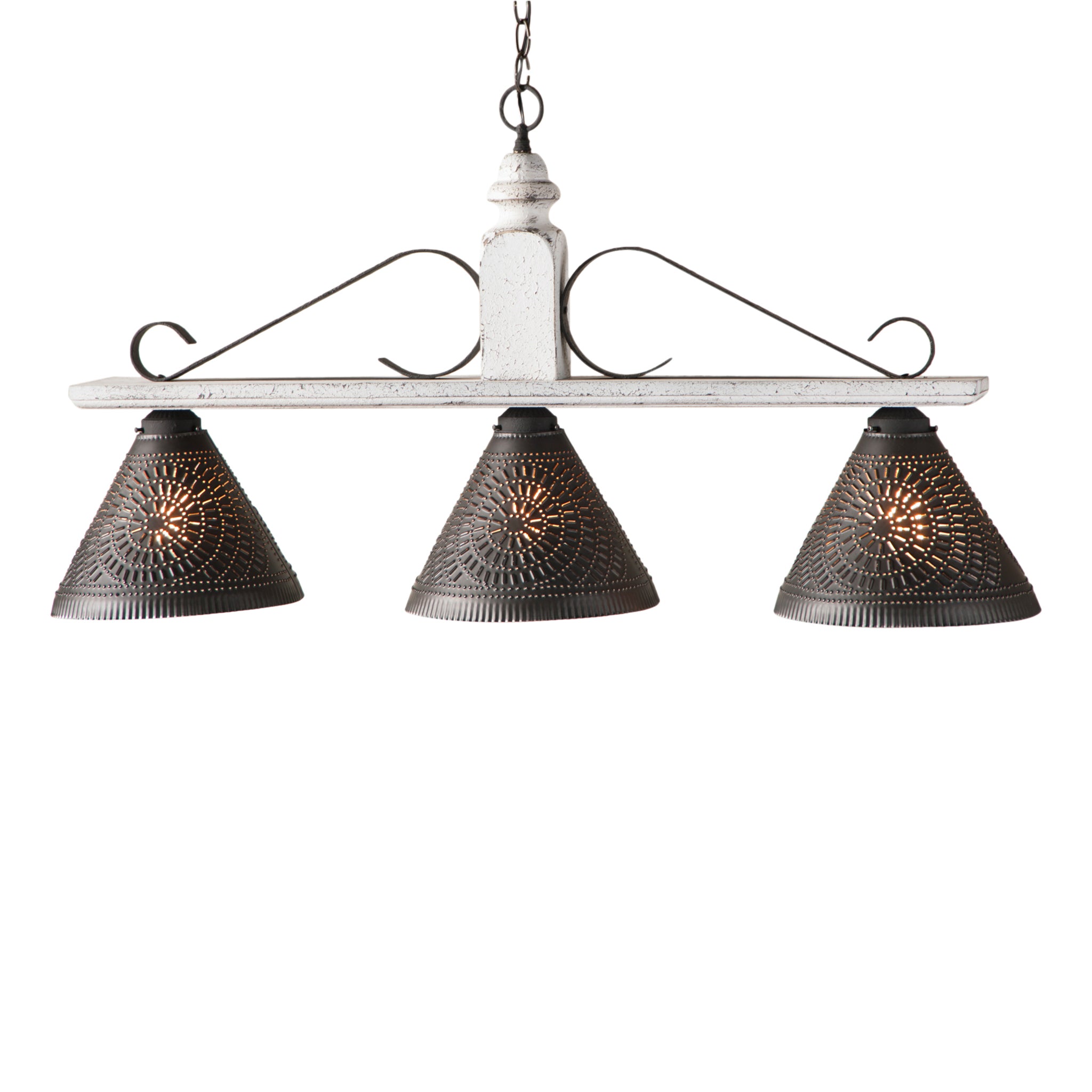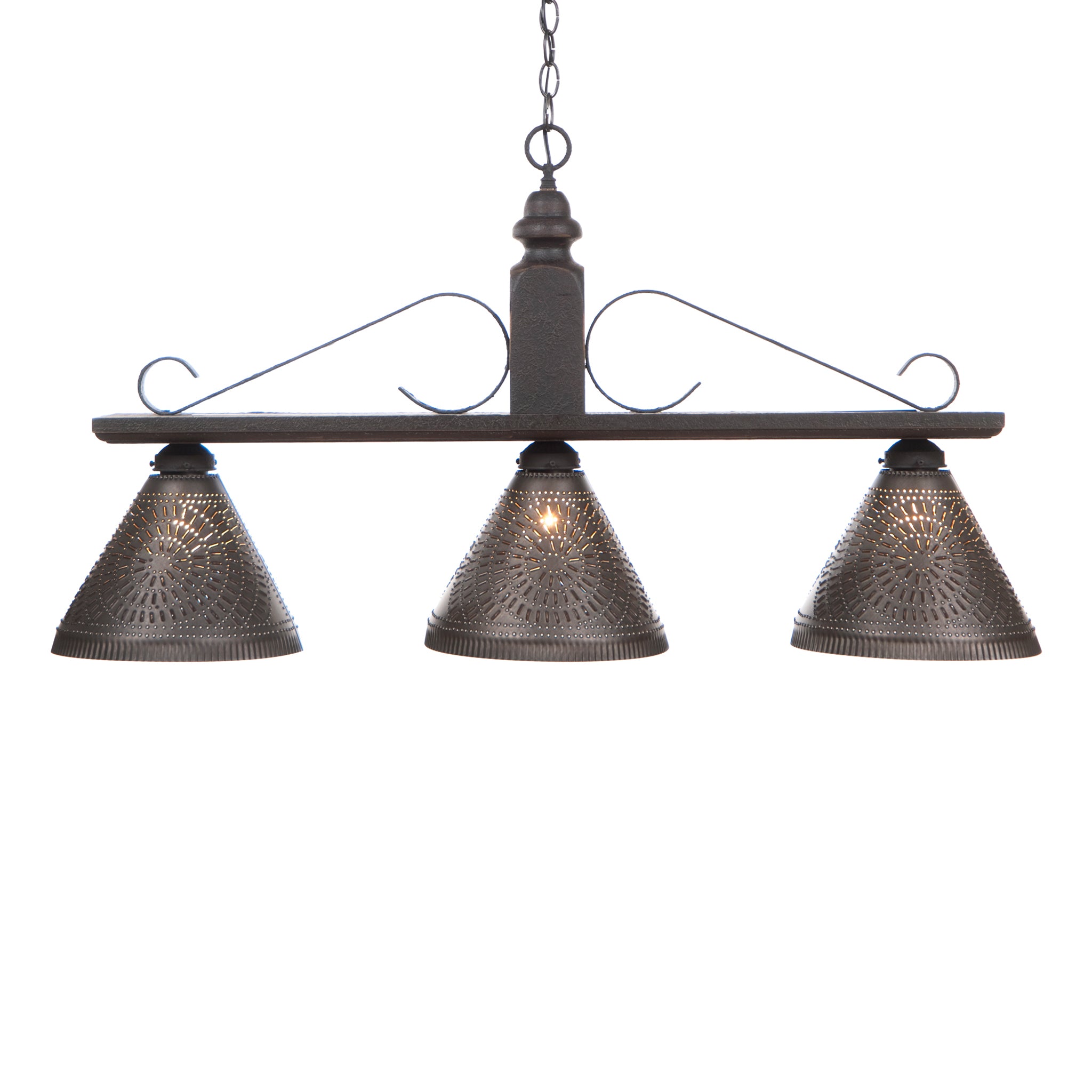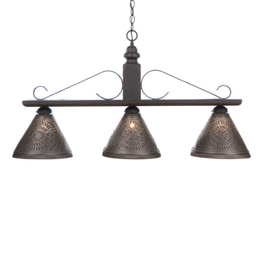 The Large Wellington Light is a bold, commanding fixture that enhances any living space in your home. Perfect for kitchens over an island or sink, it also works beautifully in game rooms or above a large table. With a sturdy wooden crossbar, wrought iron scroll brackets, and Kettle Black punched tin shades, this light combines timeless elegance with rustic charm.