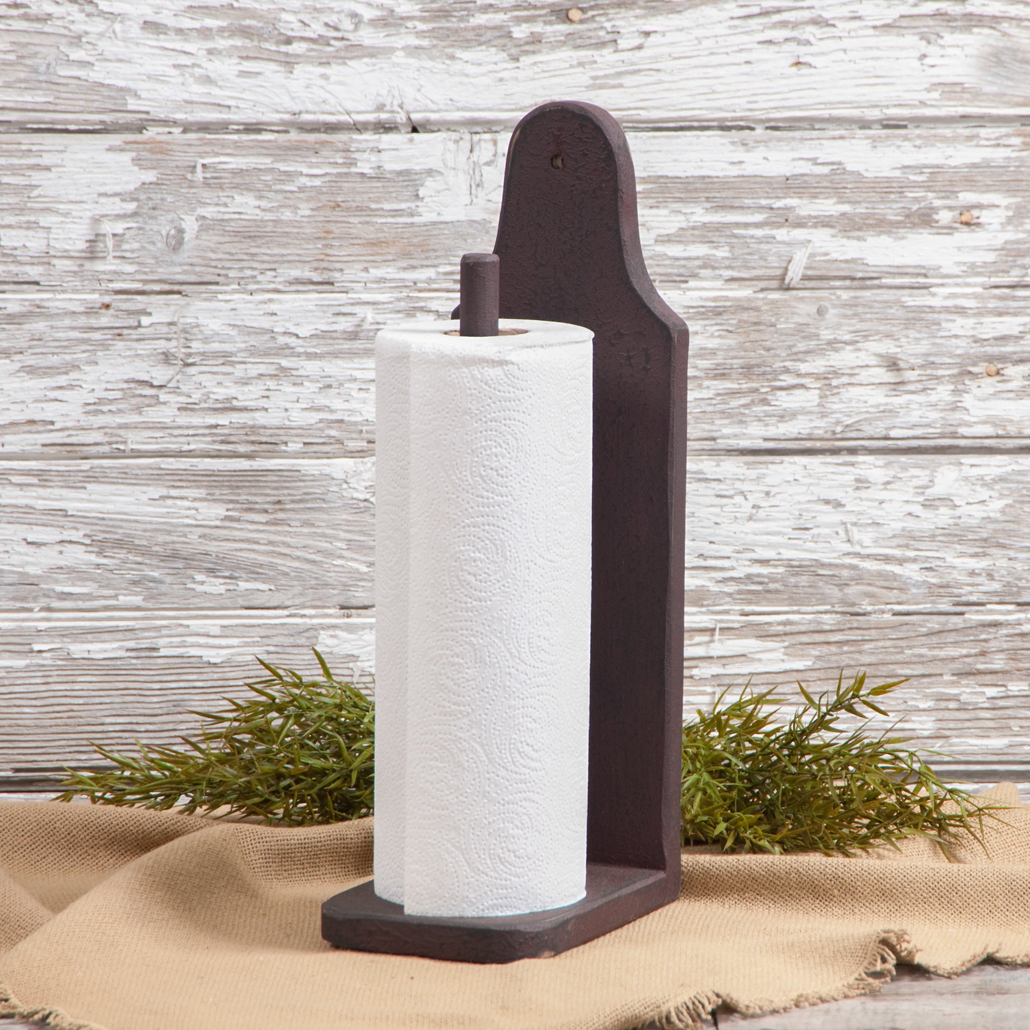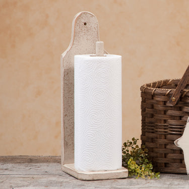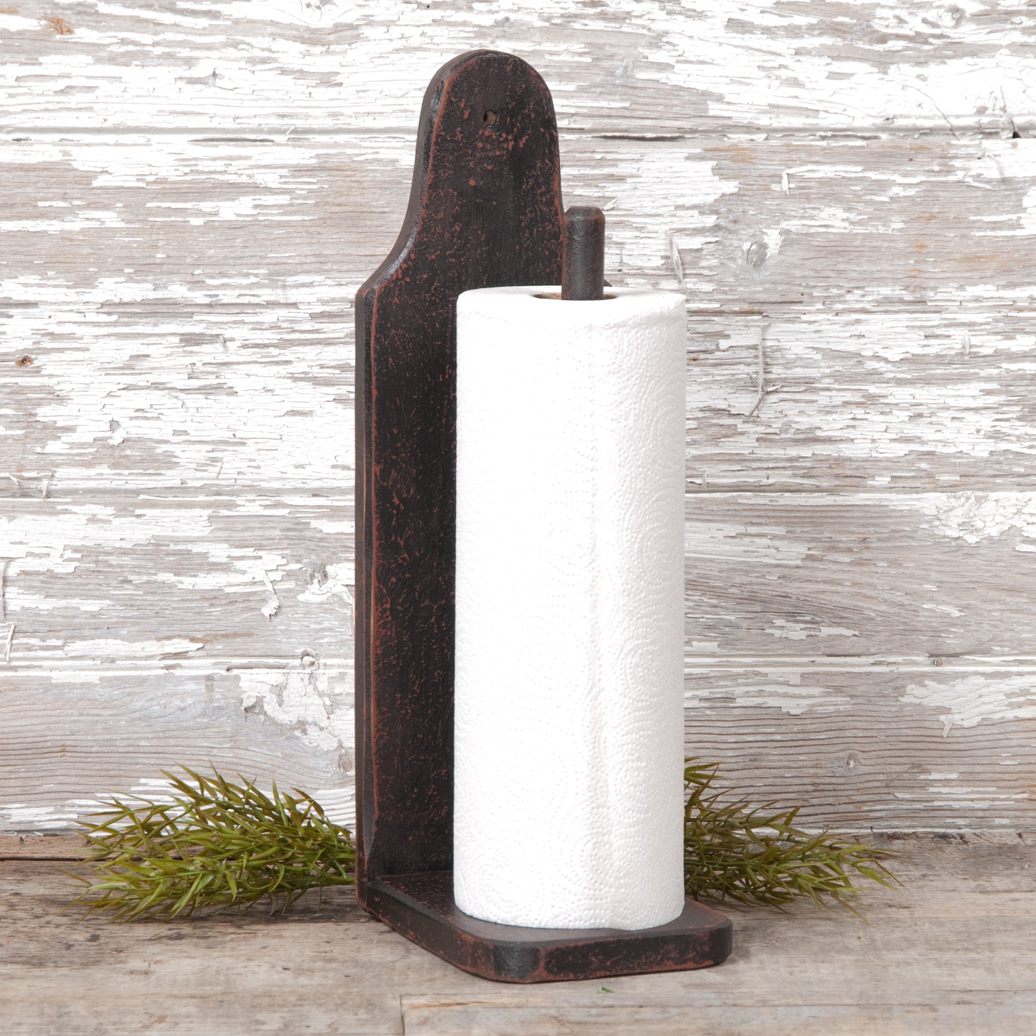 Keep your paper towels handy in charming country style. This rustic wooden holder features a distressed finish and sturdy backboard design for easy wall or countertop use. Perfect for your kitchen, pantry, or craft room—adding warmth and practicality to any country home. Made in the USA.