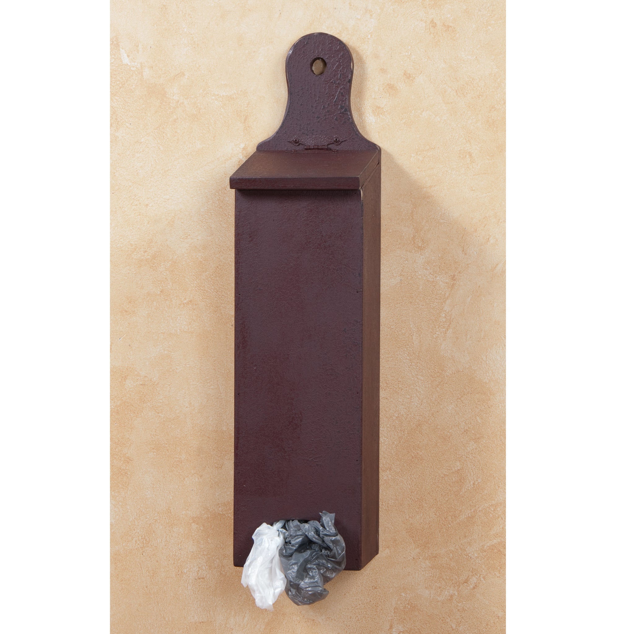 A beautiful and functional piece to use in the mudroom, kitchen, or basement. Each storage box is designed with a lift-top lid and a cutout near the bottom for dispensing the plastic bags. Created from pine wood. Keyhole cutout for hanging. Made in the USA.