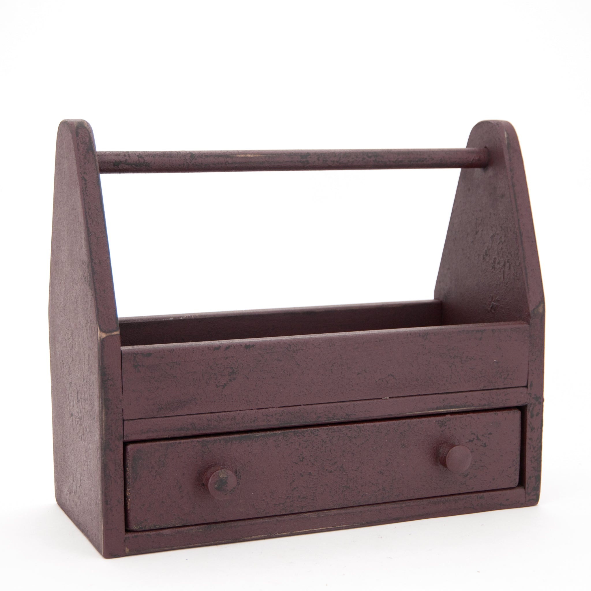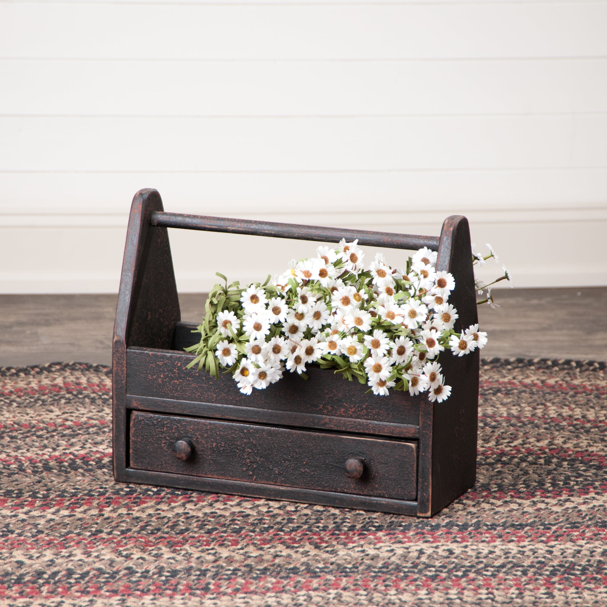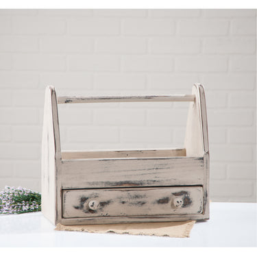 A beautiful wooden tote box with a working drawer accent to grace your table in any season. Imagine this piece filled with pine and white lights or full of springtime flowers. The possibilities are endless! Created from pine wood with textured paint finish. Made in the USA.