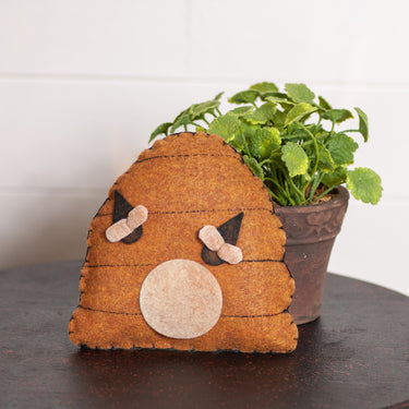 Add a charming touch of whimsy to your home with this handcrafted wool applique beehive bowl filler. Perfect for primitive or farmhouse decor, it features soft felt detailing and rich, warm tones. Tuck it into a basket, tiered tray, or display shelf for a sweet, homespun accent that celebrates nature's busiest workers - bees! Made in the USA.
