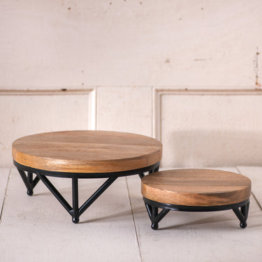 Add charm to your home or office with these stylish risers. Crafted from solid wood and wrought iron, each set includes two sizes for versatile display options. The sturdy design ensures long-lasting use, while the stained wood tops and iron bases make them a perfect fit for rustic or country-style decor. Handcrafted in India.